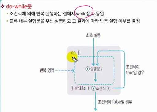 조건식이 true일 경우에 계속해서 반복한다. 조건식에는 비교 또는 논리 연산식이 오는데 조건식이 false일 경우 반복행위를 멈추고 while문을 종료한다.