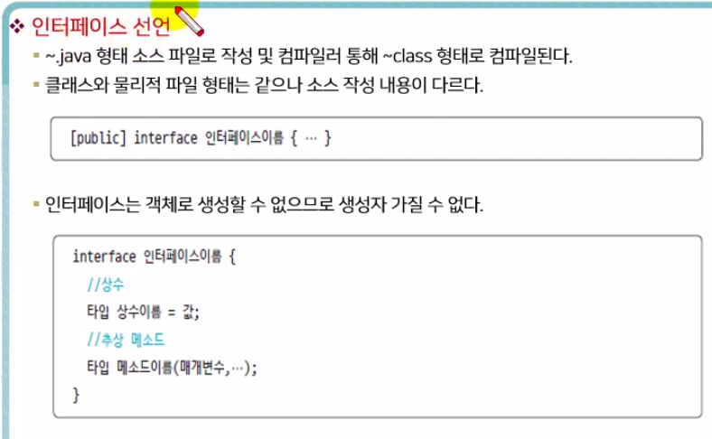 확인되어져있는 스타틱파이널필드, 추상메서드 규격을 따르고 있다. 실체화가 되어있지 않기 때문에 직접 인스턴스화 못함 , 선택적인 것이 없기 때문에 기능을 따른다는 것이다.