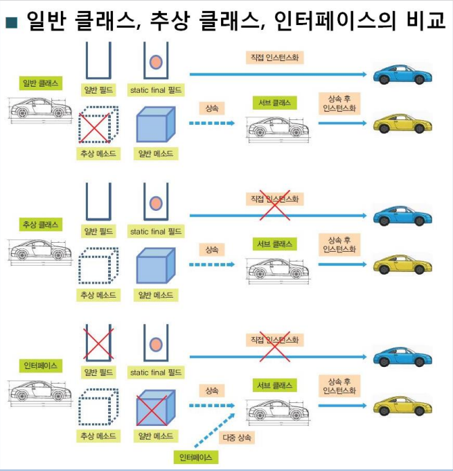 ● 일반클래스: 추상메소드 같이 못함, 추상메소드: 완성체가아닌 미완의 메소드