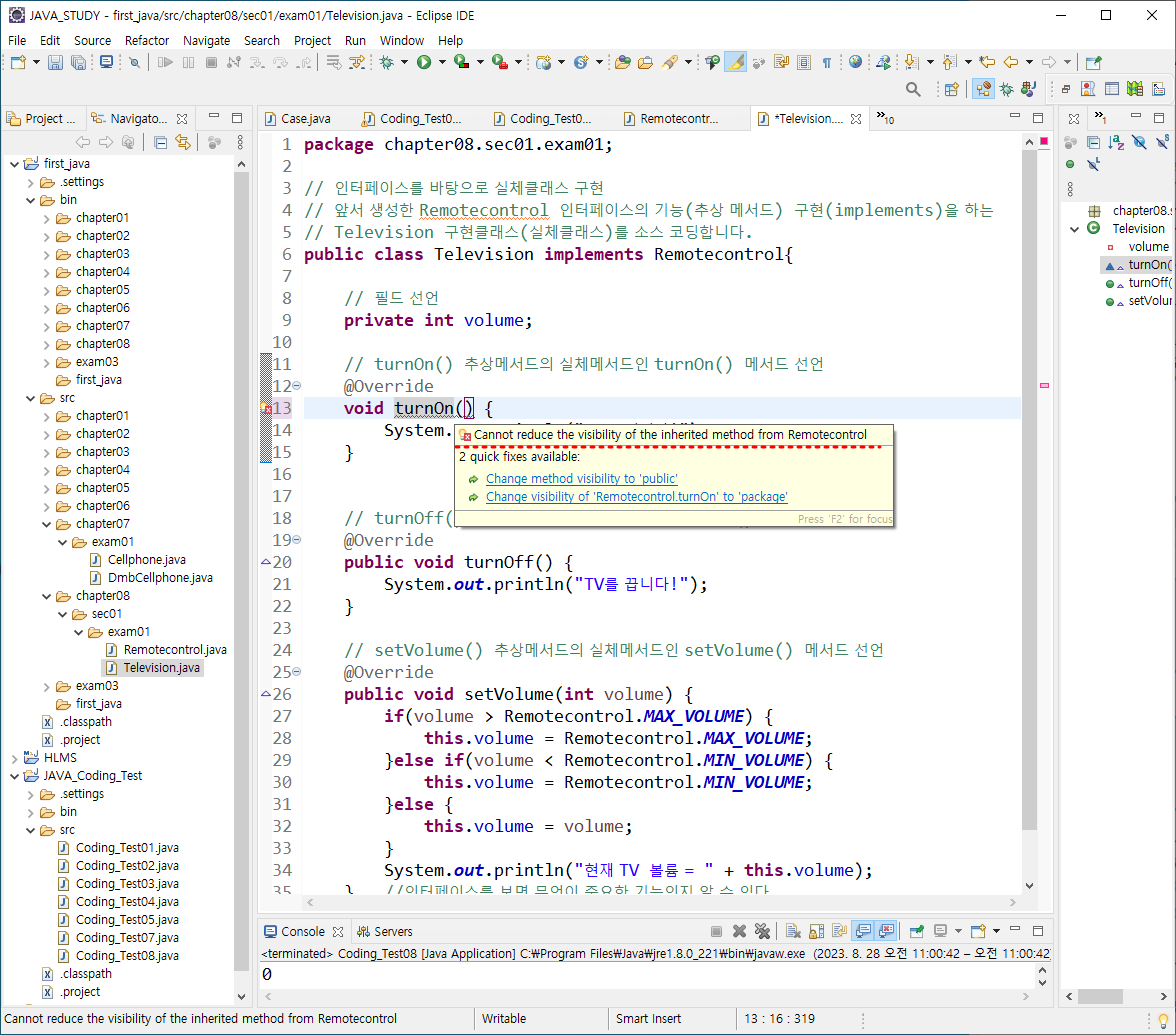 인터페이스의 모든 메소드는 기본 public접근제한을 갖기 때문에 더 낮은 접근 제한으로 작성할 수 없다.