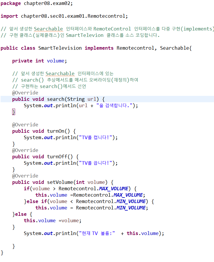 public class SmartTelevision implements chapter08.exam02.Remotecontrol, Searchable{