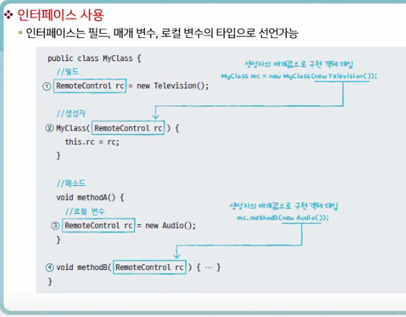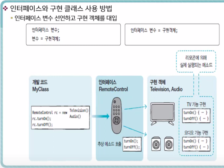 인터페이스로 구현 객체 사용하려면 인터페이스 변수를 선언하고 구현 객체를 대입해야한다.