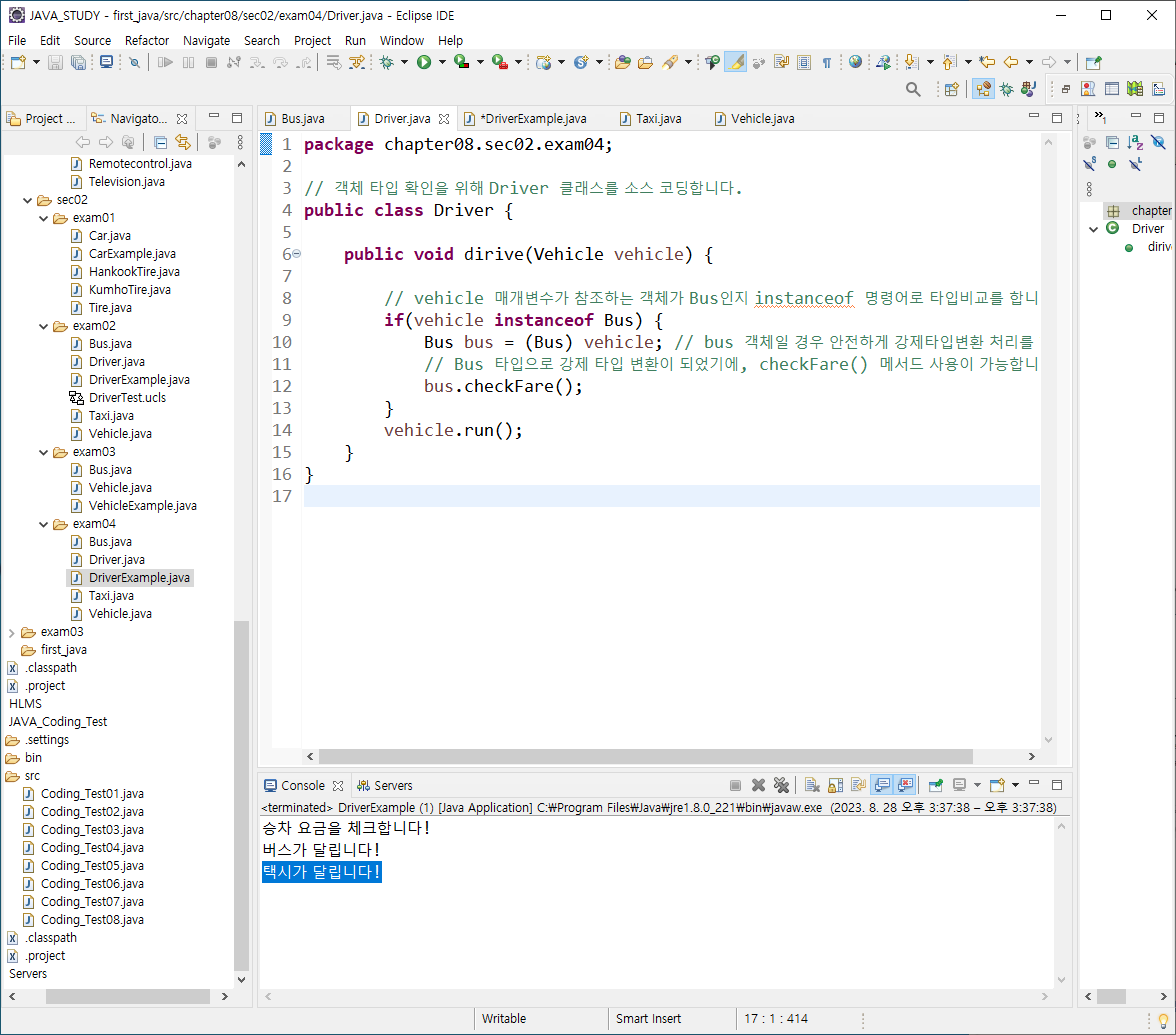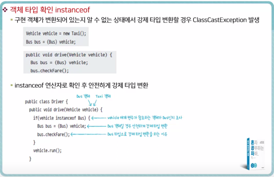 어떤 구현 객체가 변환되어 있는 알수 없는 상태에서 무작정 강제타입변환할 경우 ClassCastException이 발생