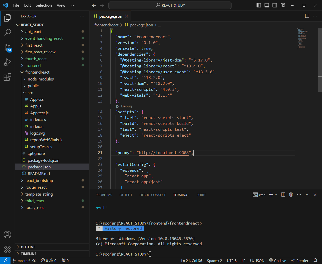 7. 앞서, package.json 파일 안에 "proxy": "http://localhost:9008", 추가했던거 확인함.