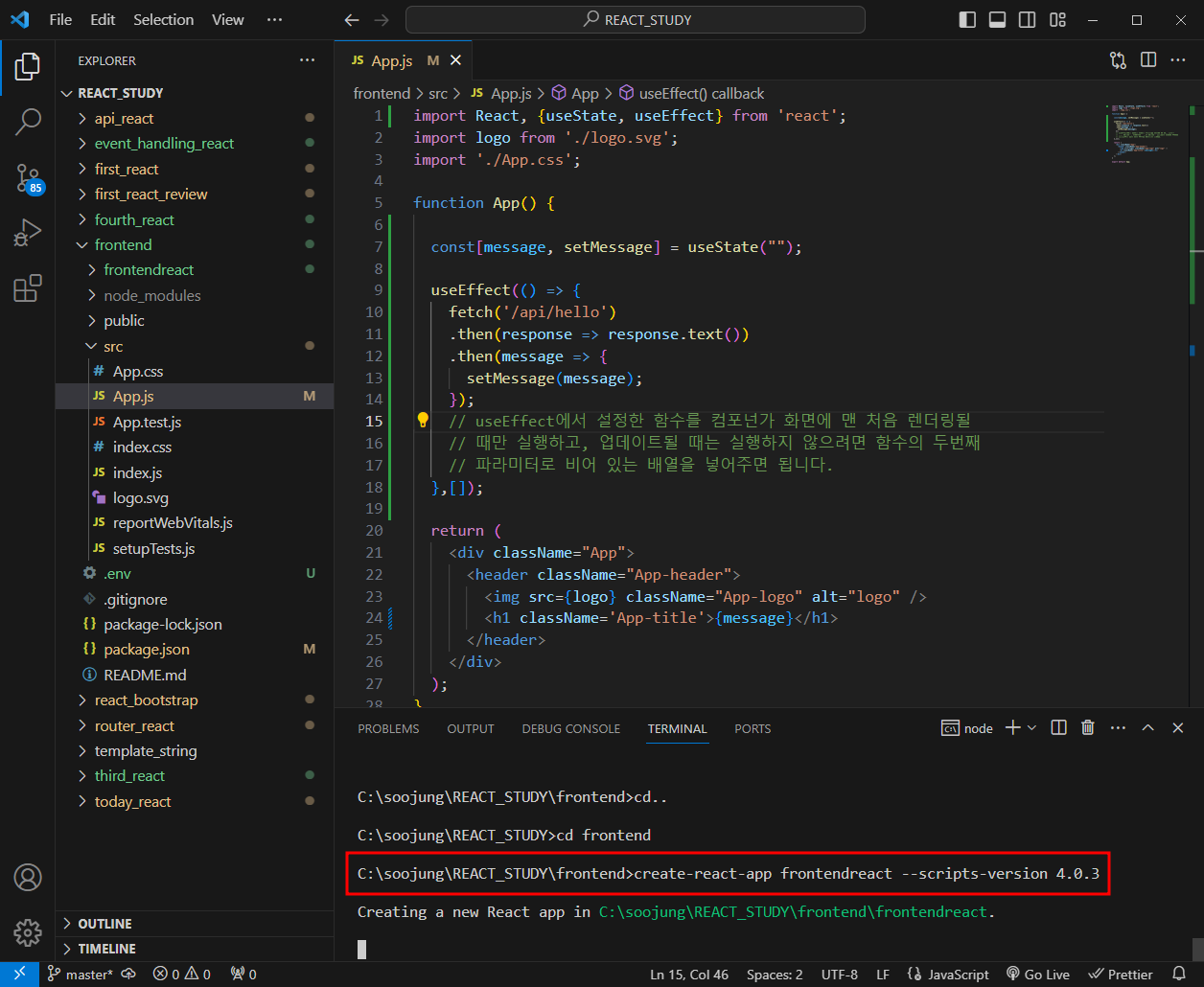 frontendreact 앱 프로젝트 생성은 create-react-app를 활용해서 설치합니다.