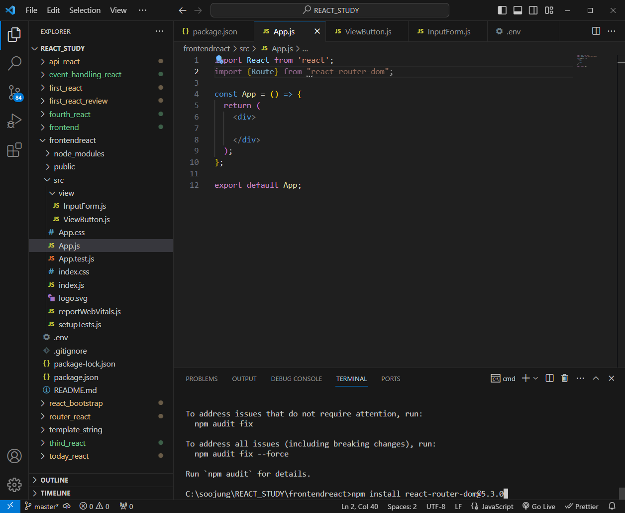 C:\ReactSpringBoot\frontendreact>npm install react-router-dom@5.3.0