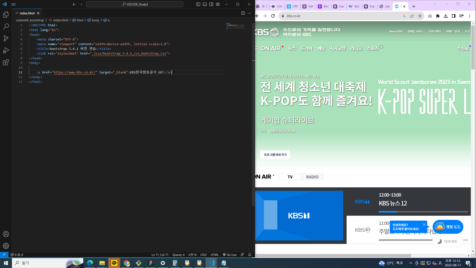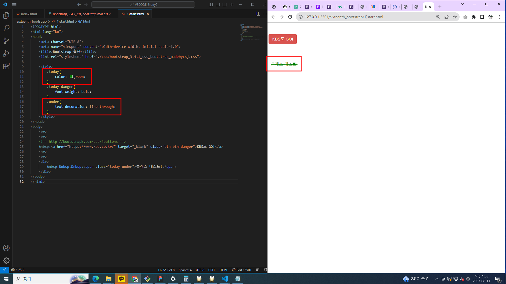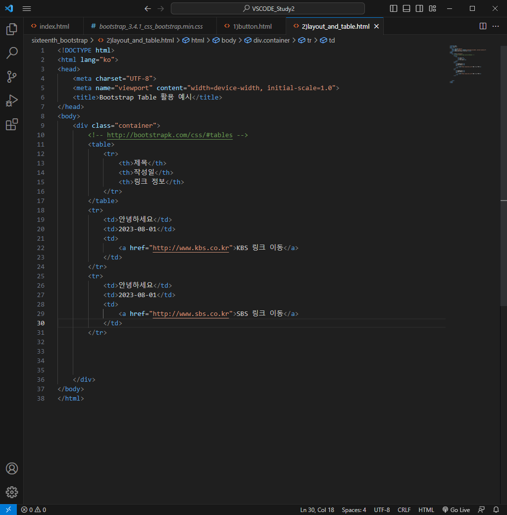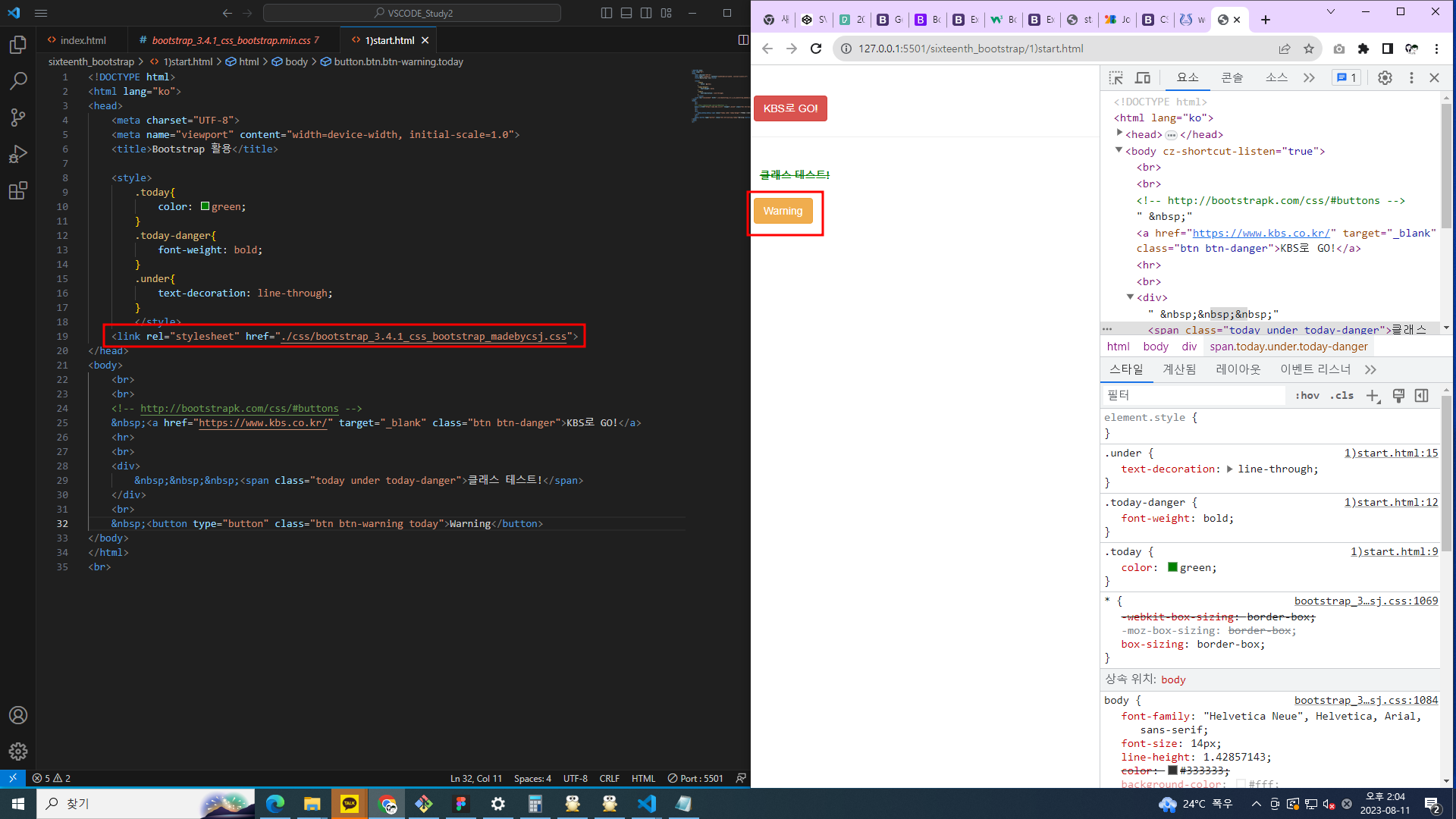 3) Bootstrap CSS CDN 경로 활용 (link rel 부분에서 Ctrl+/ 주석처리해서 부트스트랩 적용 후와 적용 전을 확인하기 바람)