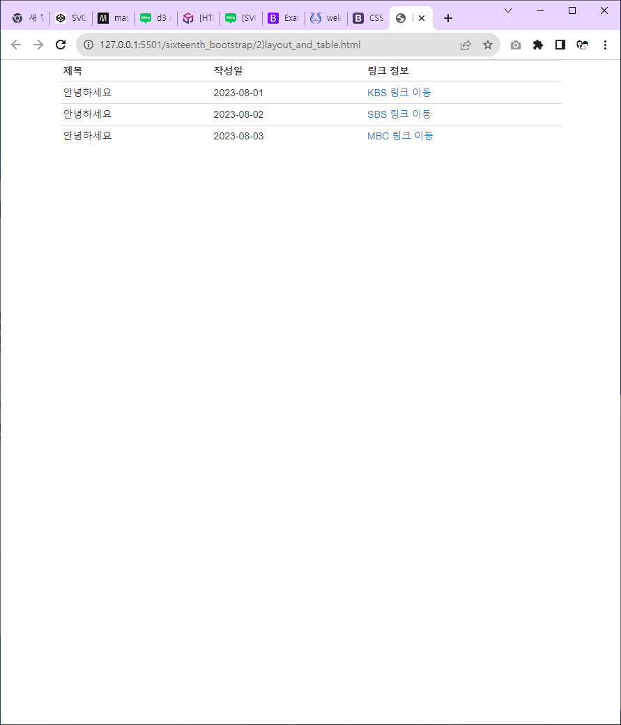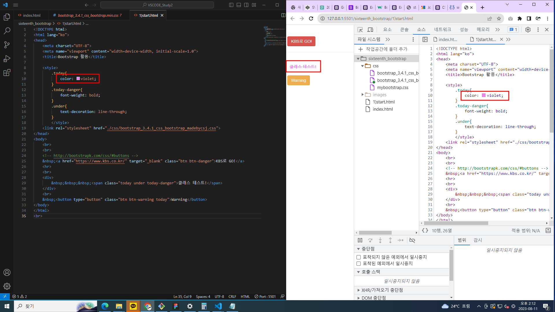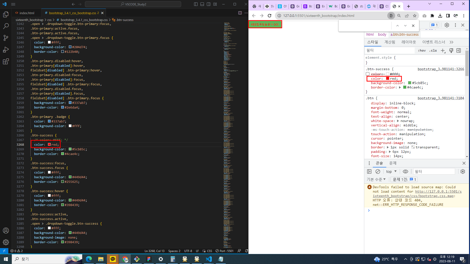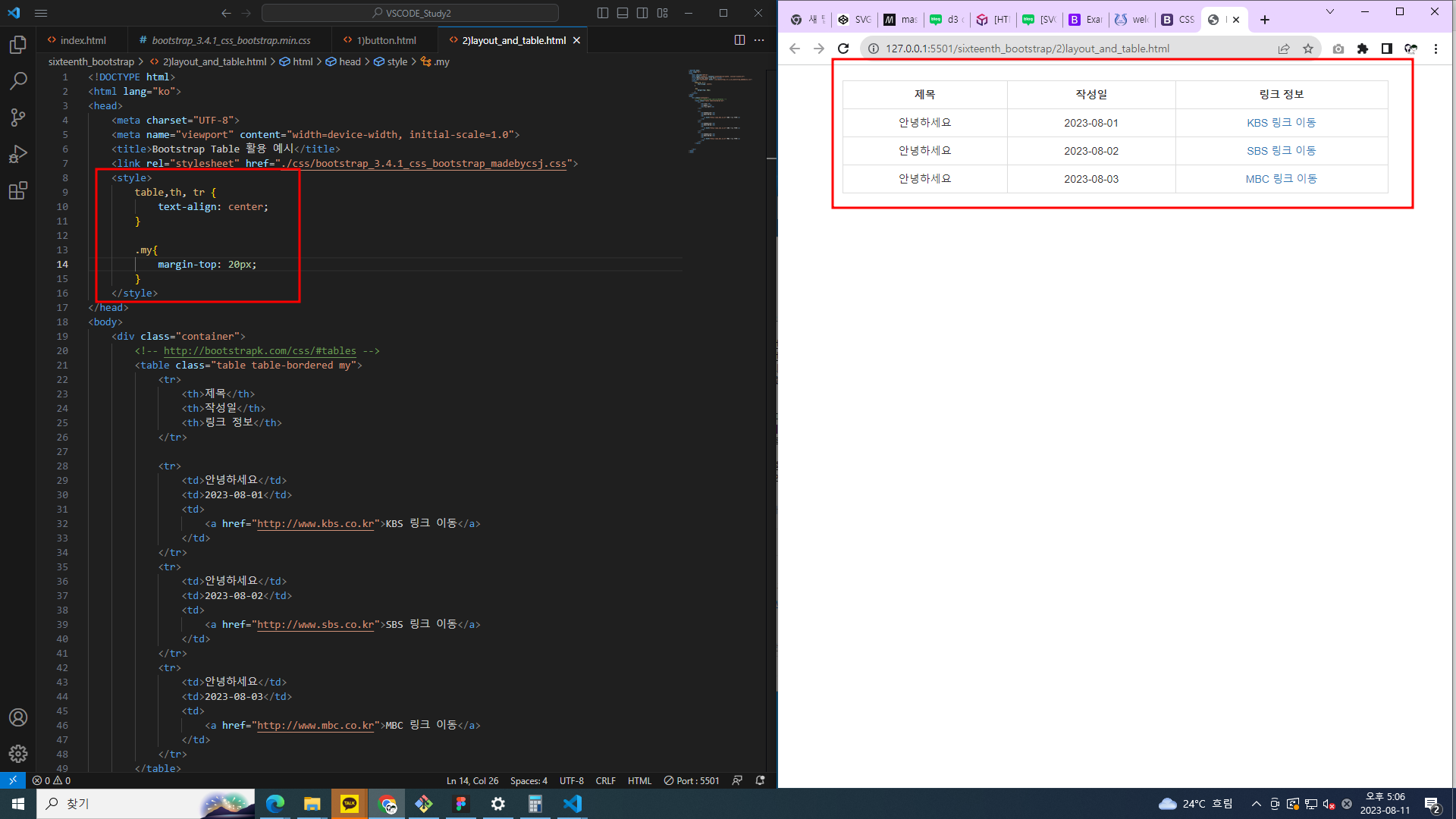 4) bootstrap.min.css 파일 활용 (link rel 부분에서 Ctrl+/ 주석처리해서 부트스트랩 적용 후와 적용 전을 확인하기 바람)