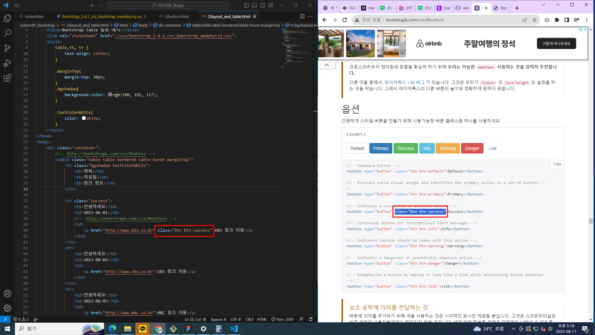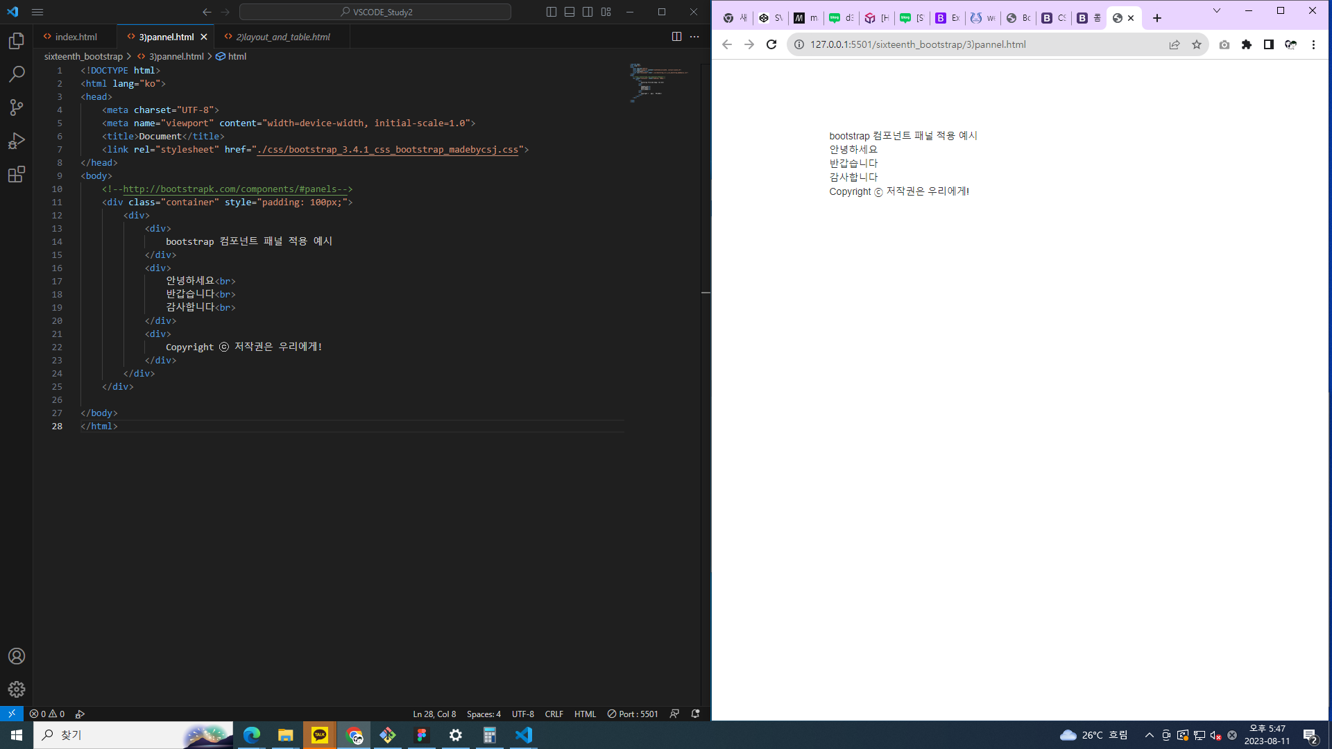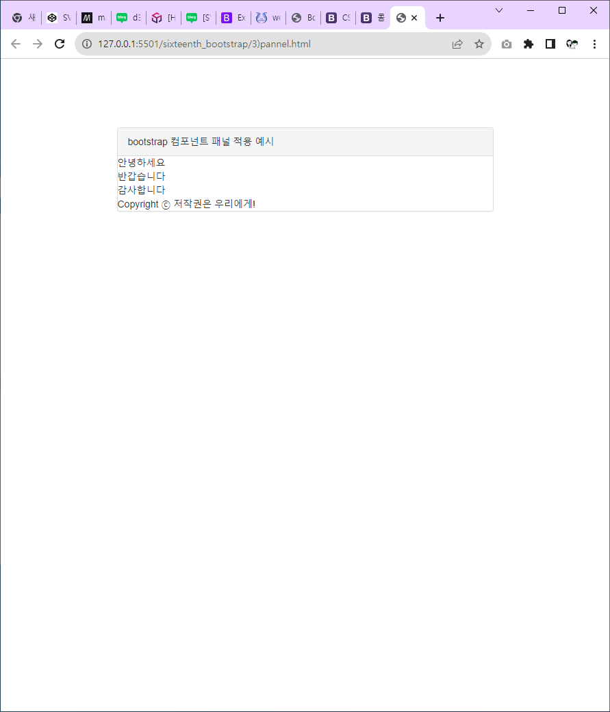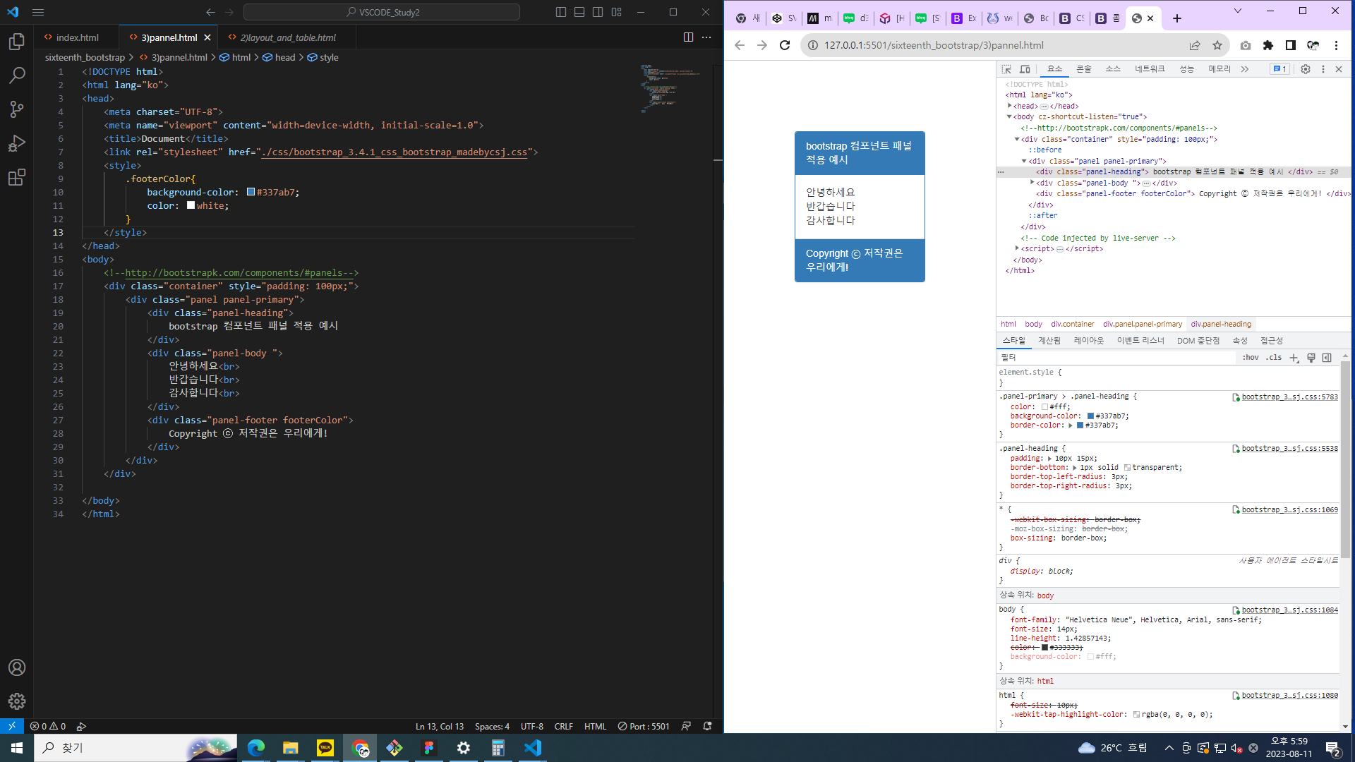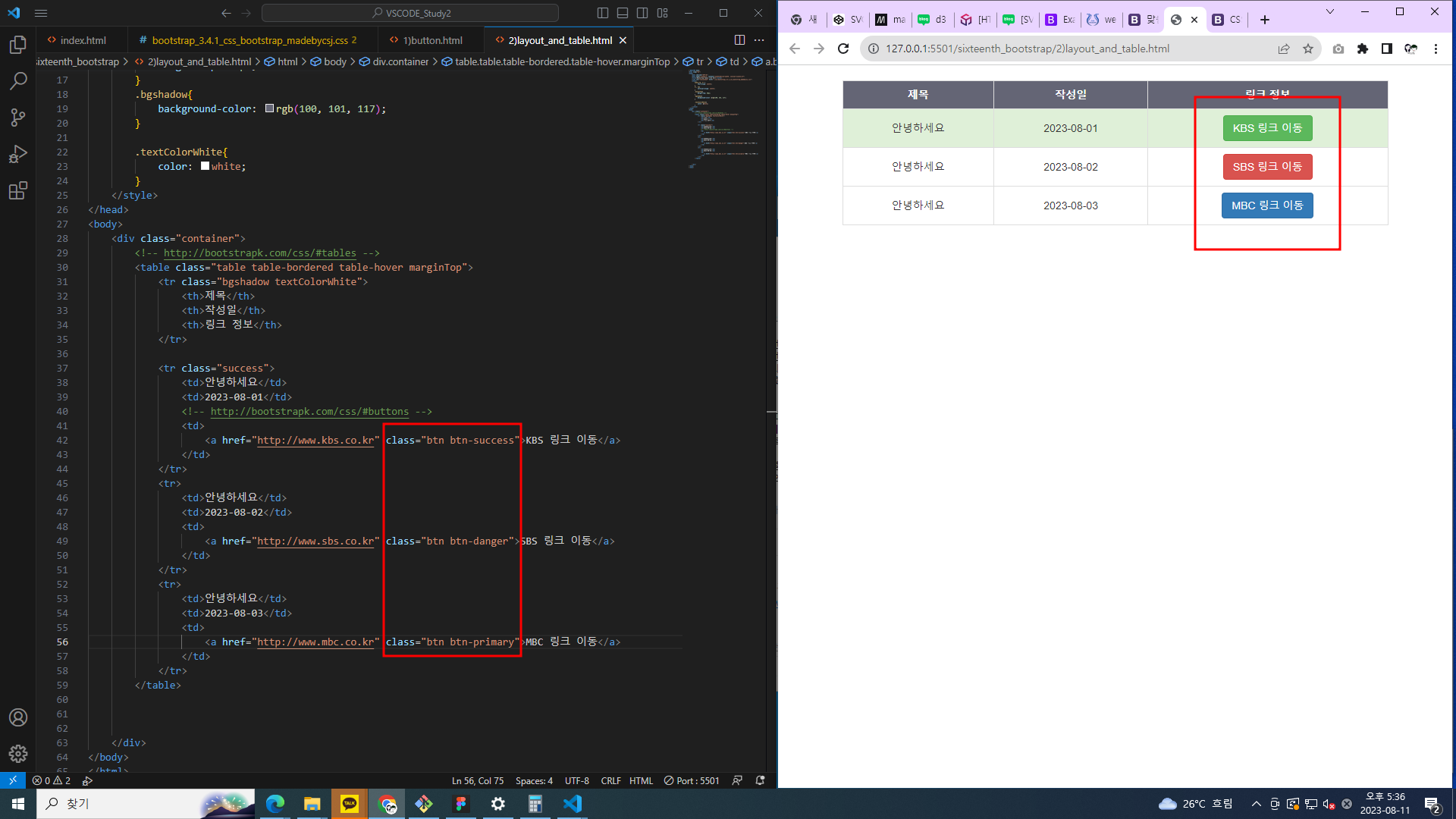 4) bootstrap.min.css 파일 활용 (link rel 부분에서 Ctrl+/ 주석처리해서 부트스트랩 적용 후와 적용 전을 확인하기 바람)