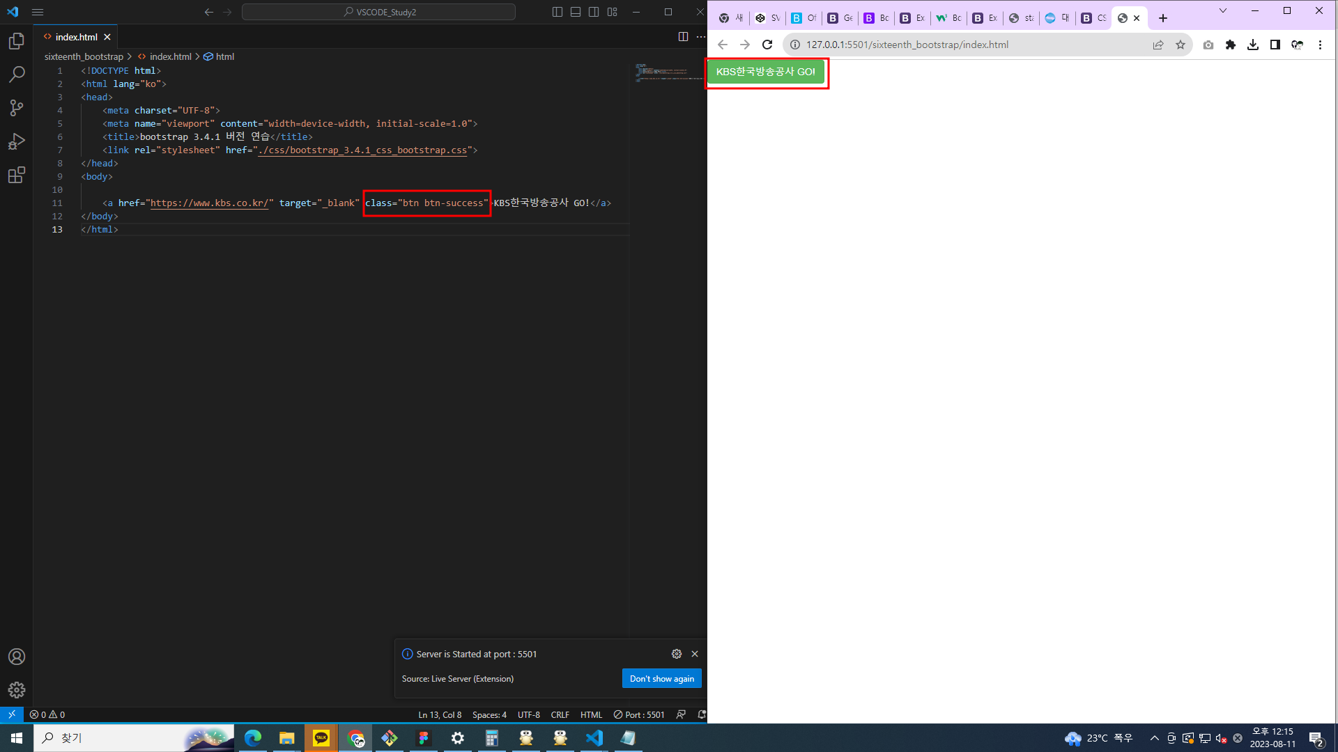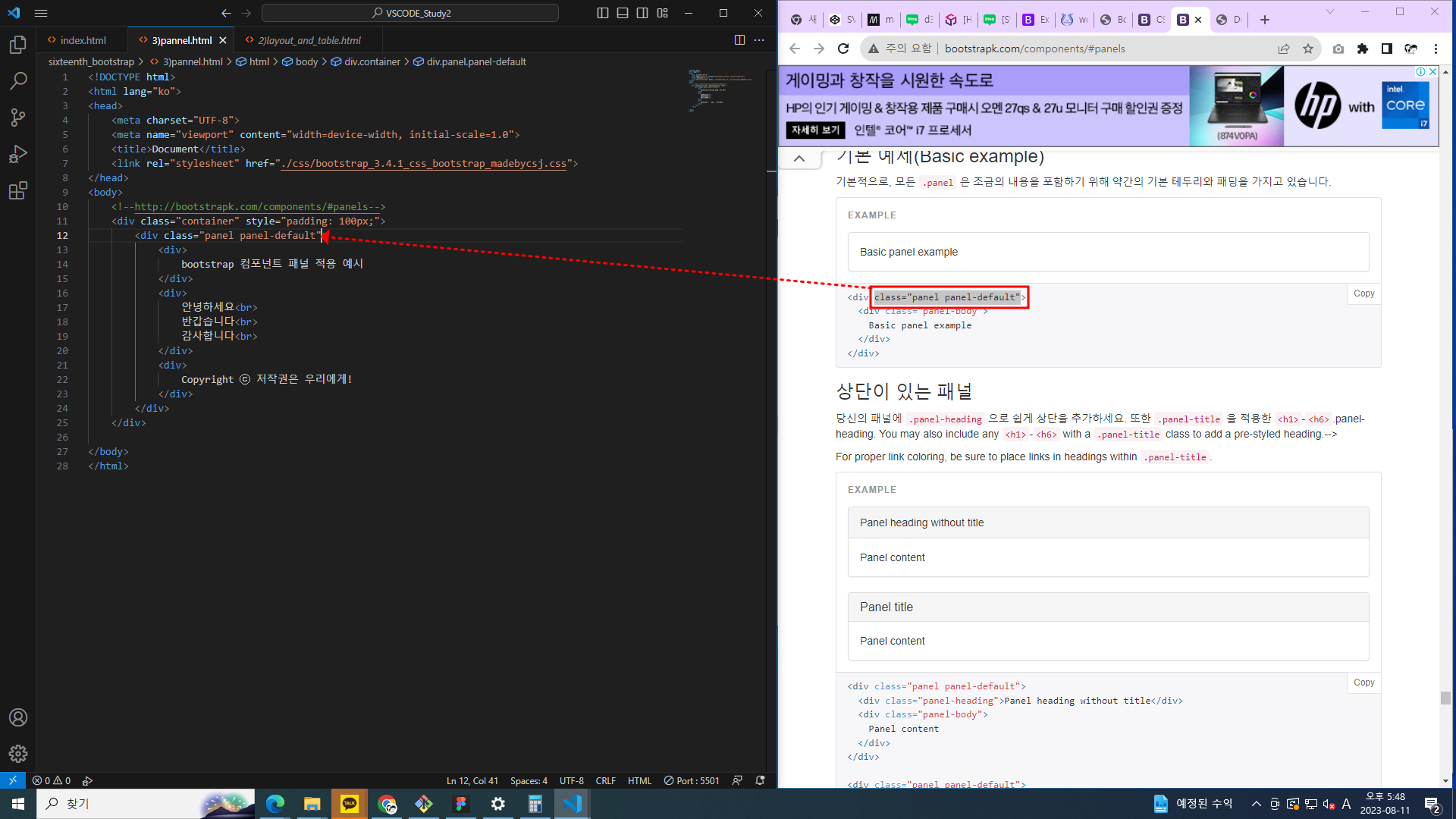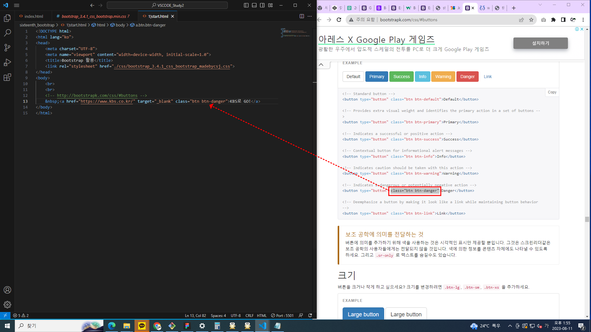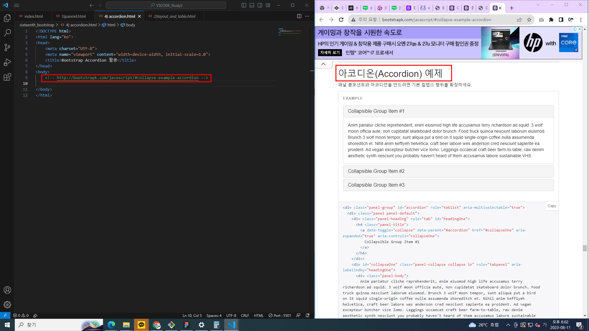 4) bootstrap.min.css 파일 활용 (link rel 부분에서 Ctrl+/ 주석처리해서 부트스트랩 적용 후와 적용 전을 확인하기 바람)