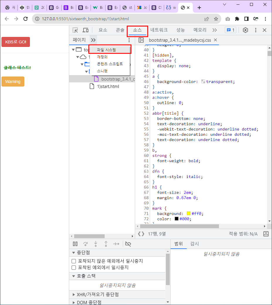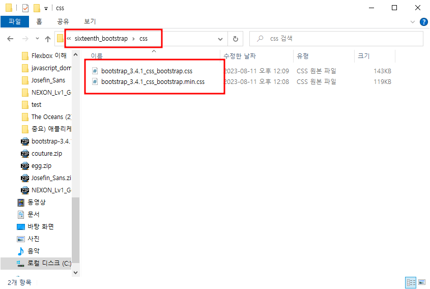 3) bootstrap 내용 확인 후 마우스 우클릭 - 다른이름으로 저장 - bootstrap.css, bootstrap.min.css 파일 저장