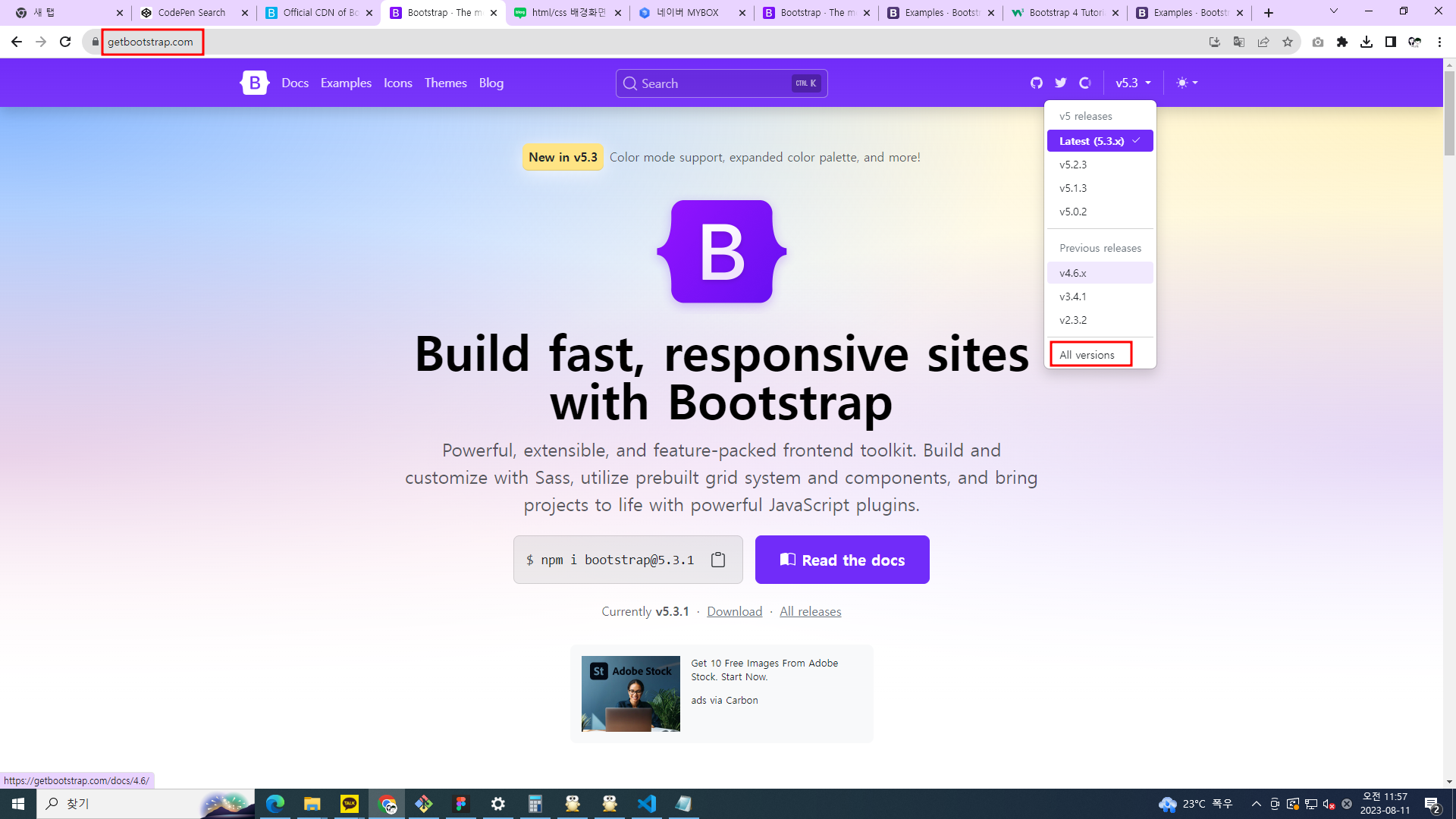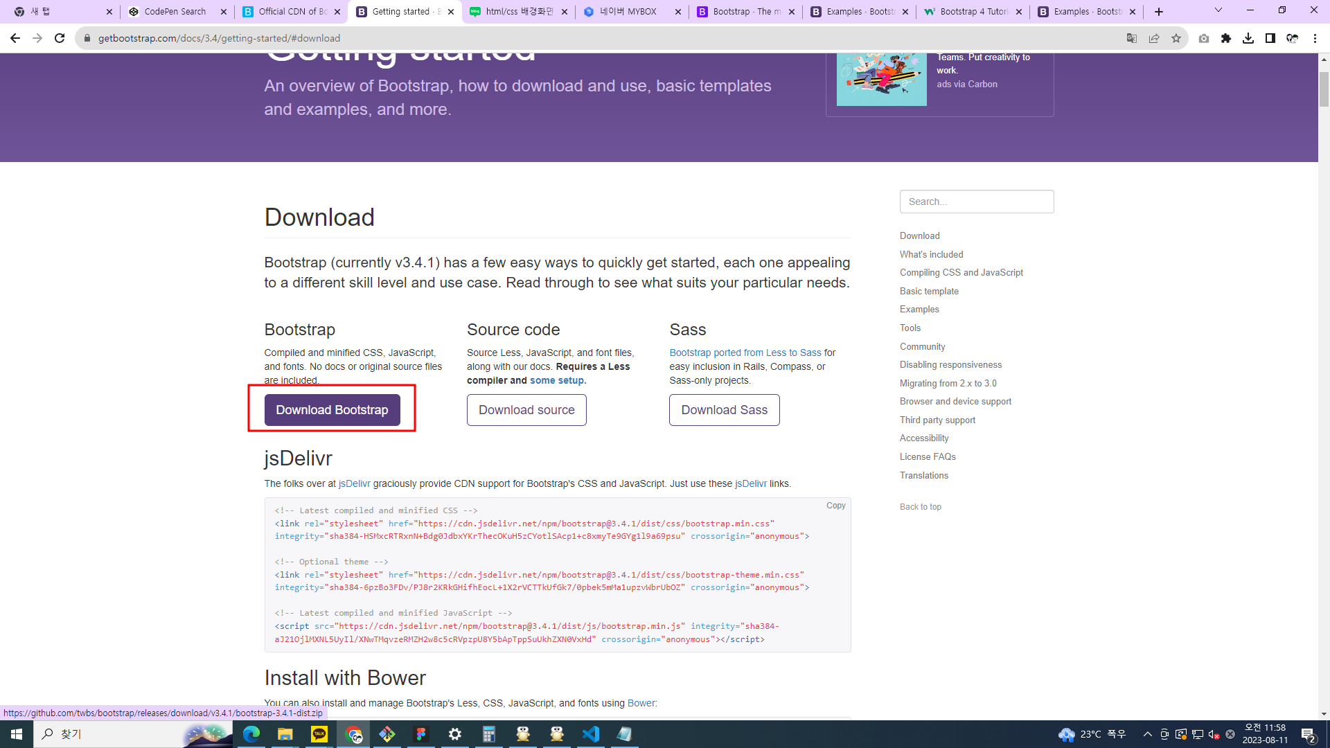 하단 CDN for 옆에 Bootstrap 키워드 클릭!