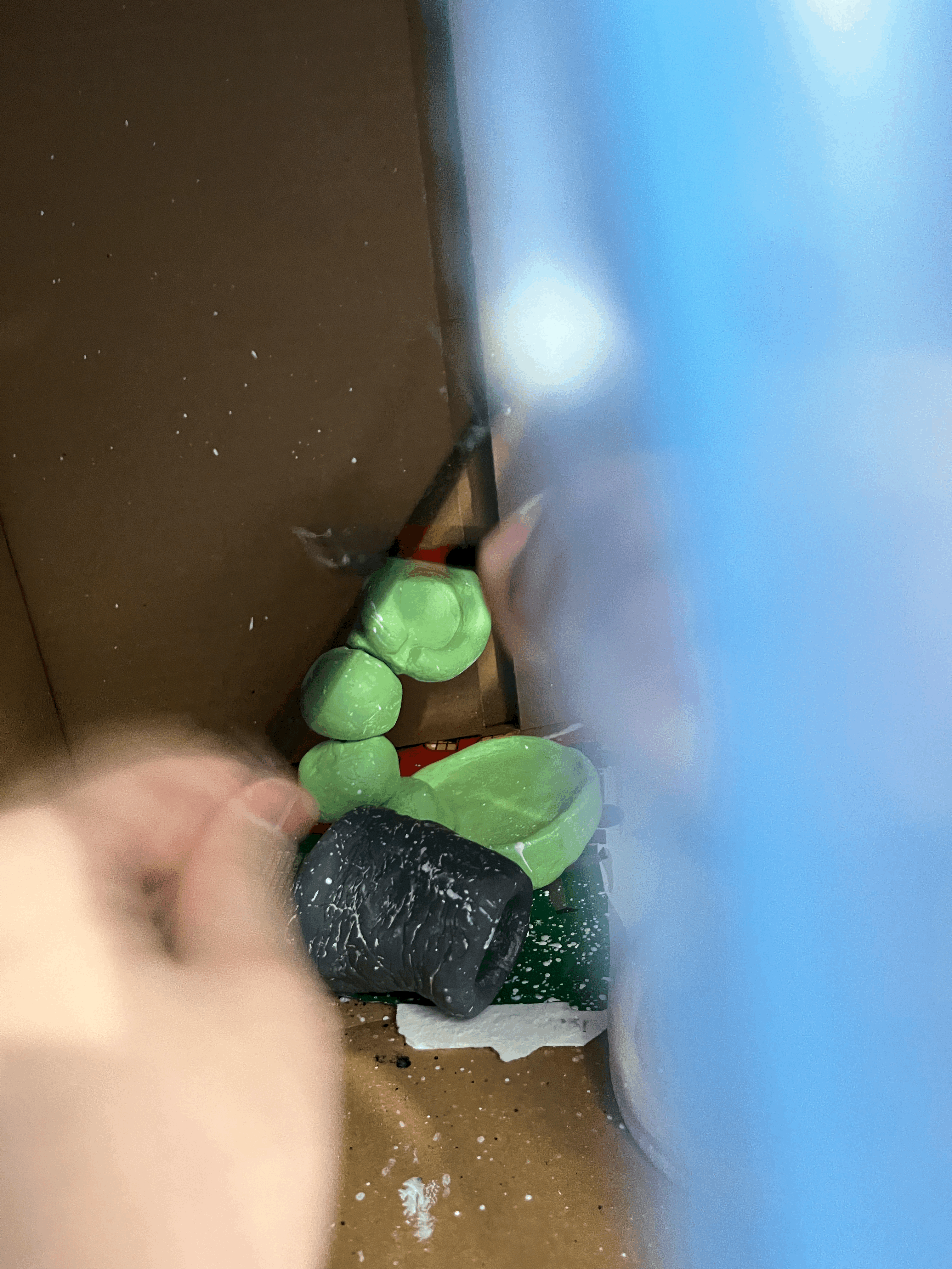 난장판 방지를 위해 박스 안에 지점토를 넣어주고 신중하게 사정없이 물감을 튀겨줍니다!