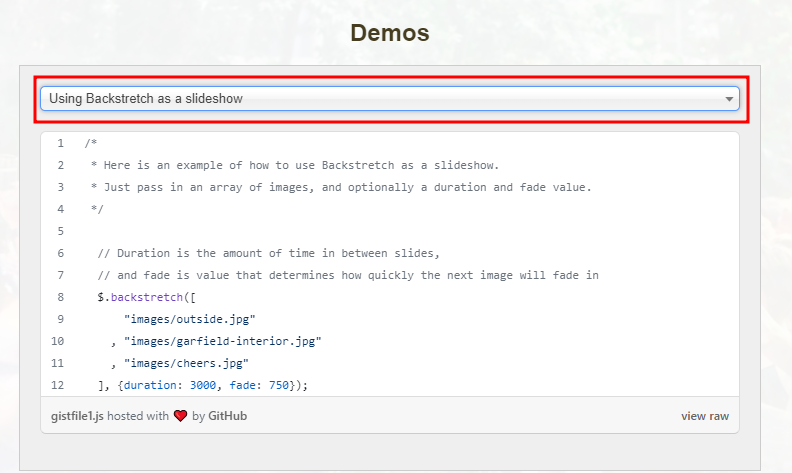 5) Vegas 플러그인에서는 slides 배열을 사용해 FullScreen 배경 이미지를 슬라이드 쇼로