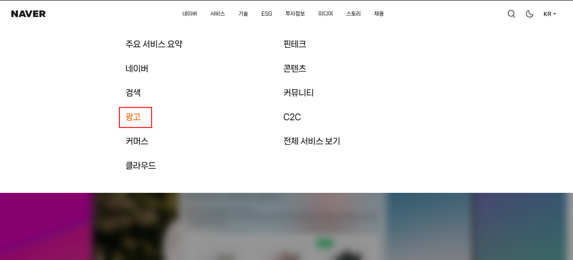 - 메뉴 아이콘을 클릭해서 나온 메뉴 중 ‘광고’를 클릭 > 검색광고 사이트 접속
