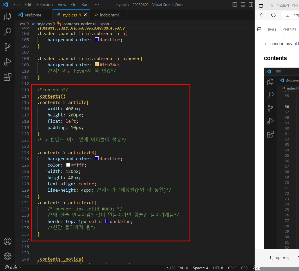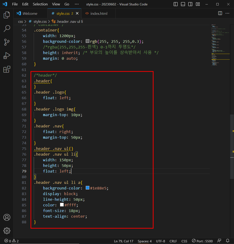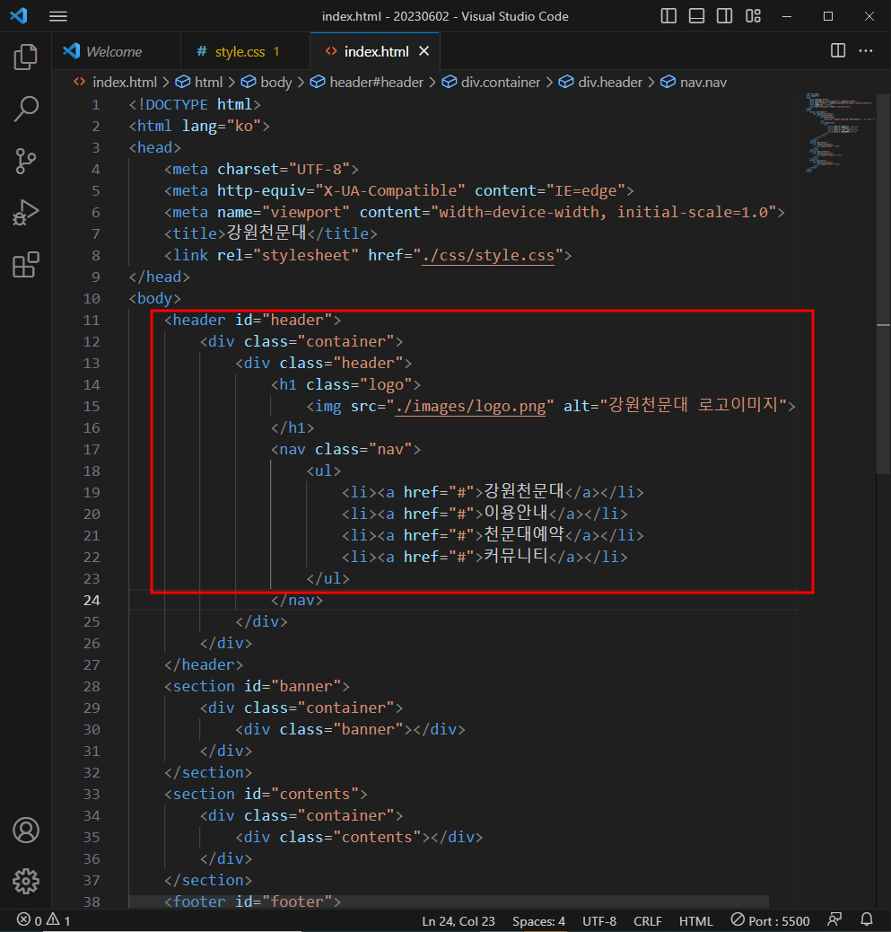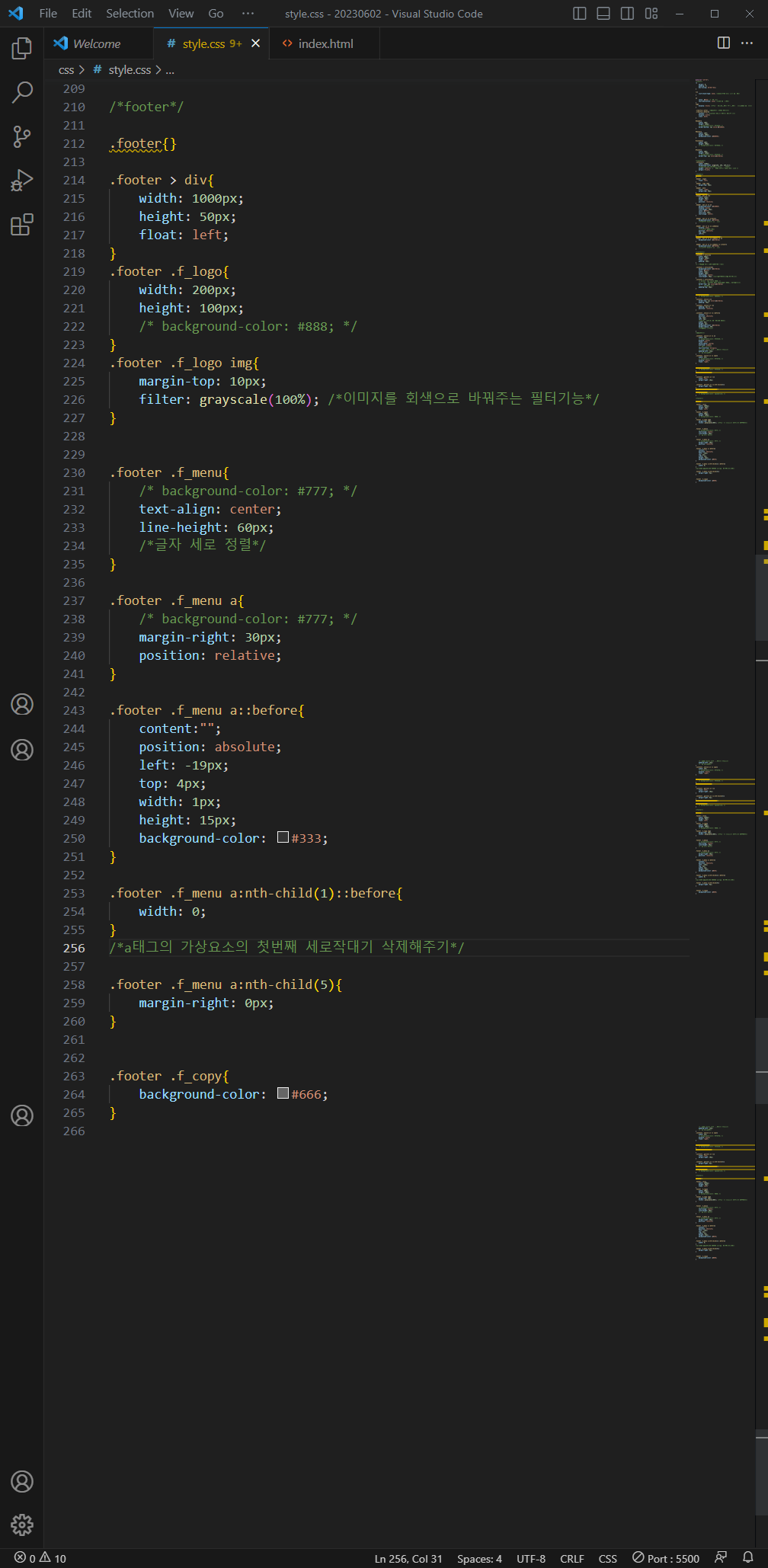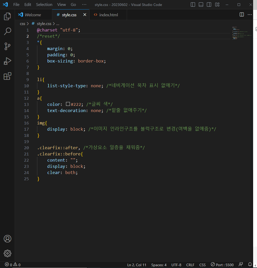 비주얼 스튜디오 코드 > new file > 파일 이름: style.css 새파일 생성 > @charset "utf-8" (셋팅을 한국어로 만들어준다<.)