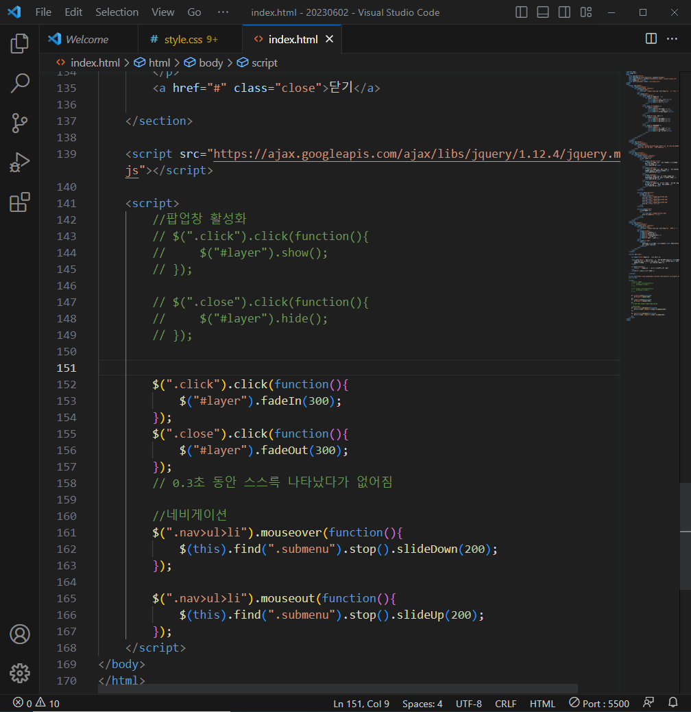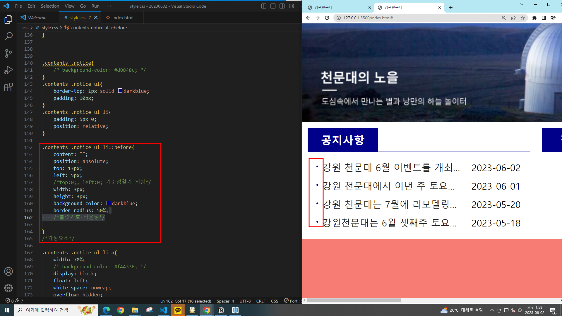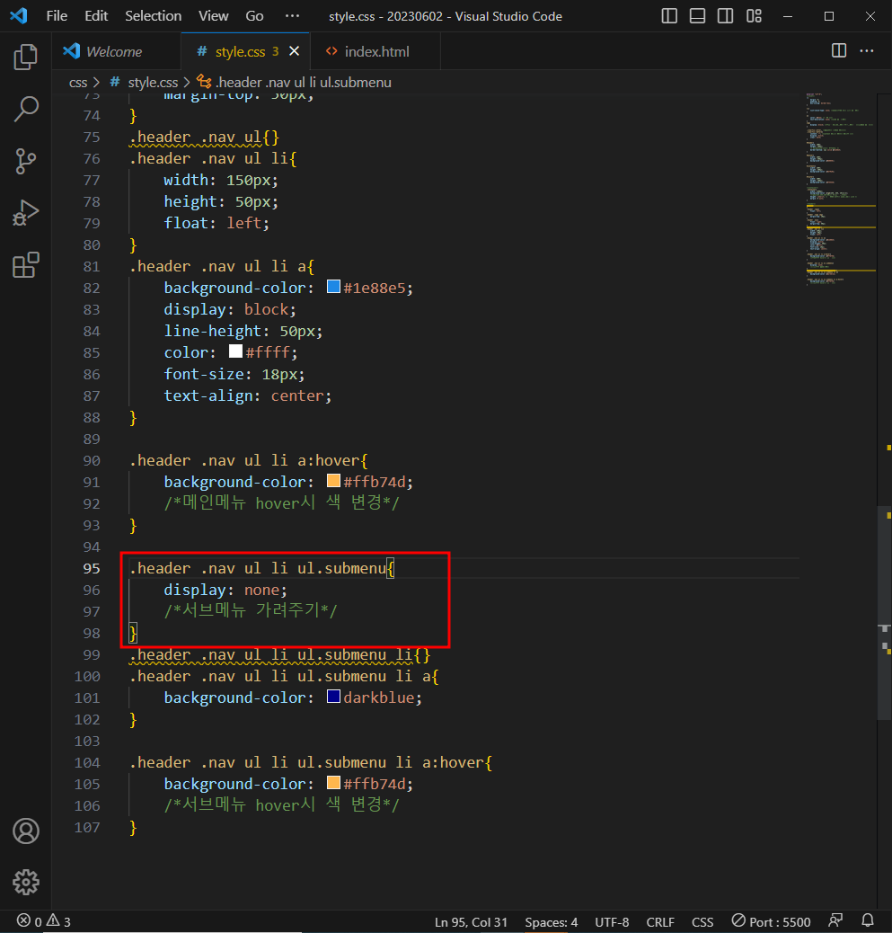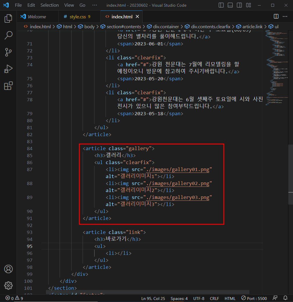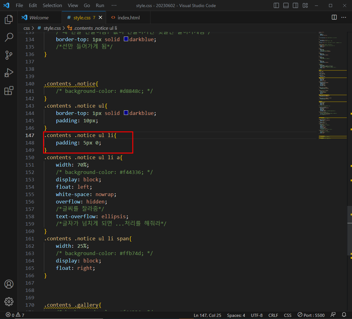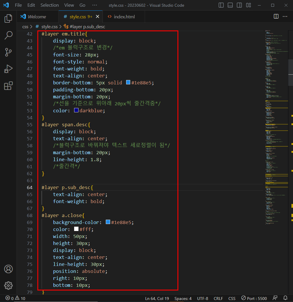 비주얼 스튜디오 코드 > new file > 파일 이름: style.css 새파일 생성 > @charset "utf-8" (셋팅을 한국어로 만들어준다<.)