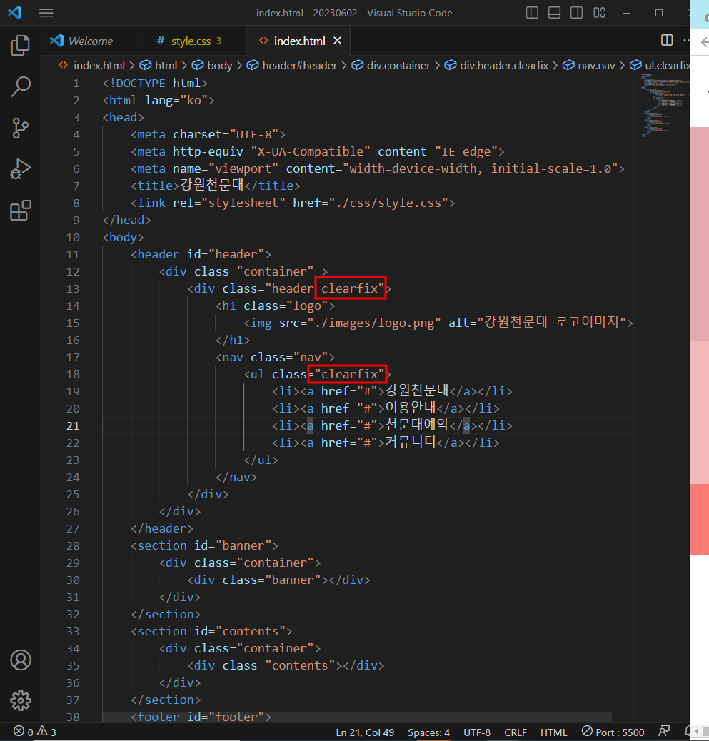 clearfix: 바로 위에 엄마에게 클리어픽스를 줘서 일층레이어를 채워줌