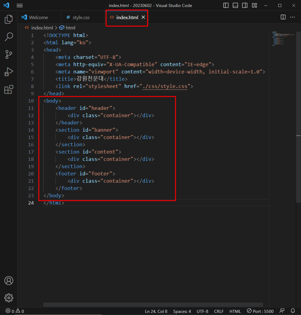 new file > index.html 파일에서 head에 style.css 링크 달아서 외부에서 불러오기