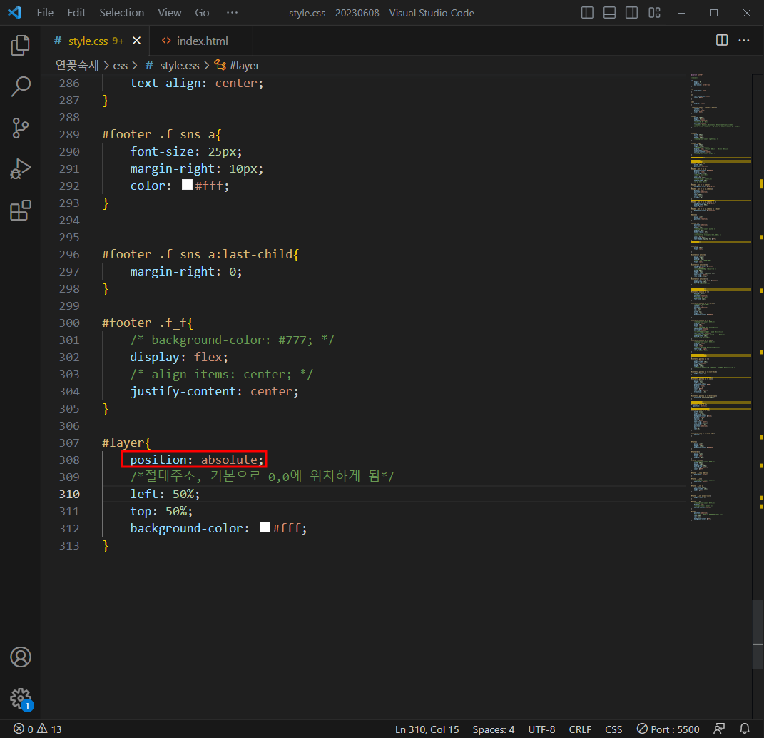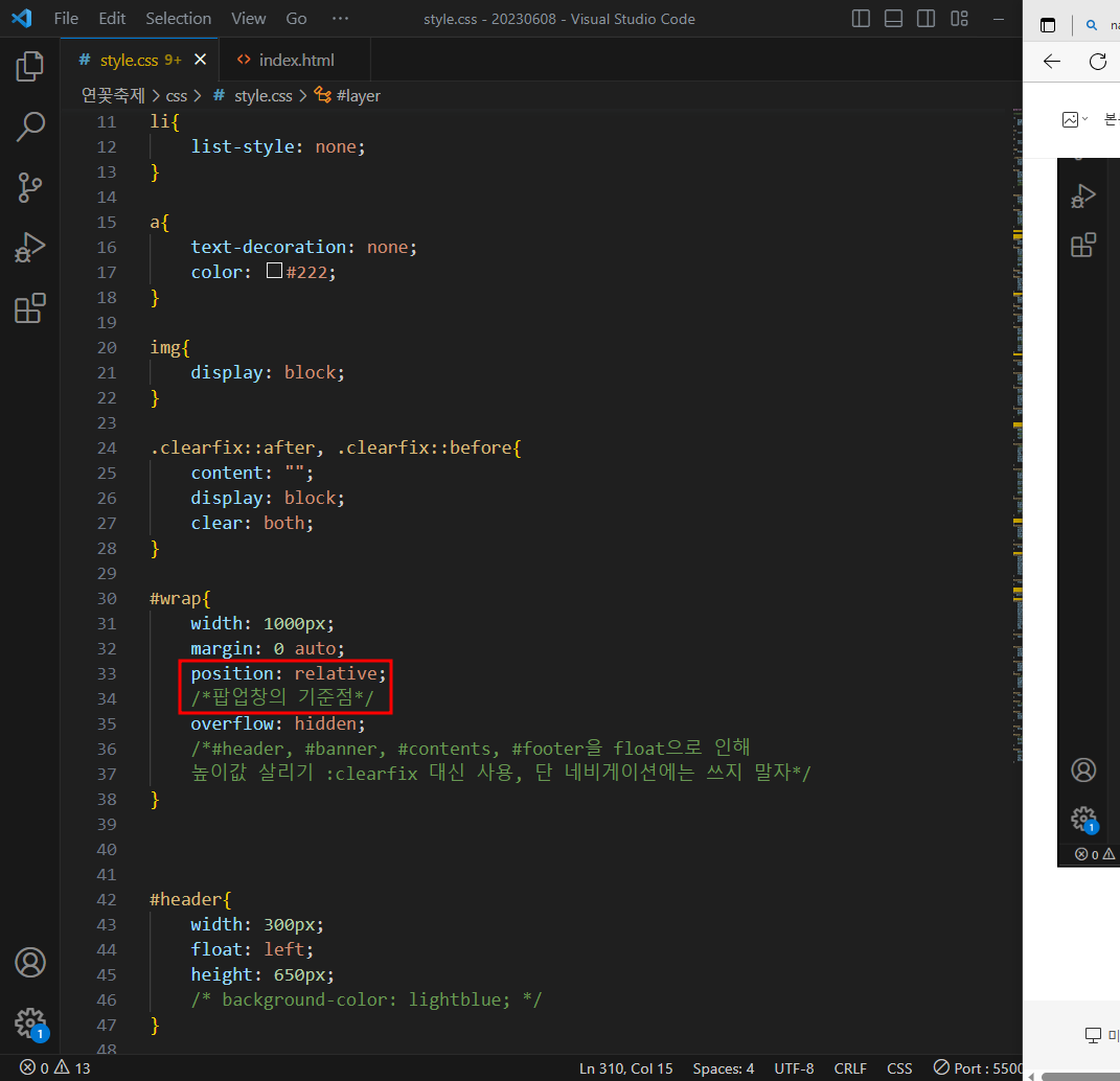 팝업창이 움직일 수 있도록 position: absolute; 명령을 주고 #wrap을 기준점으로 잡아 position: relative 명령을 준다.