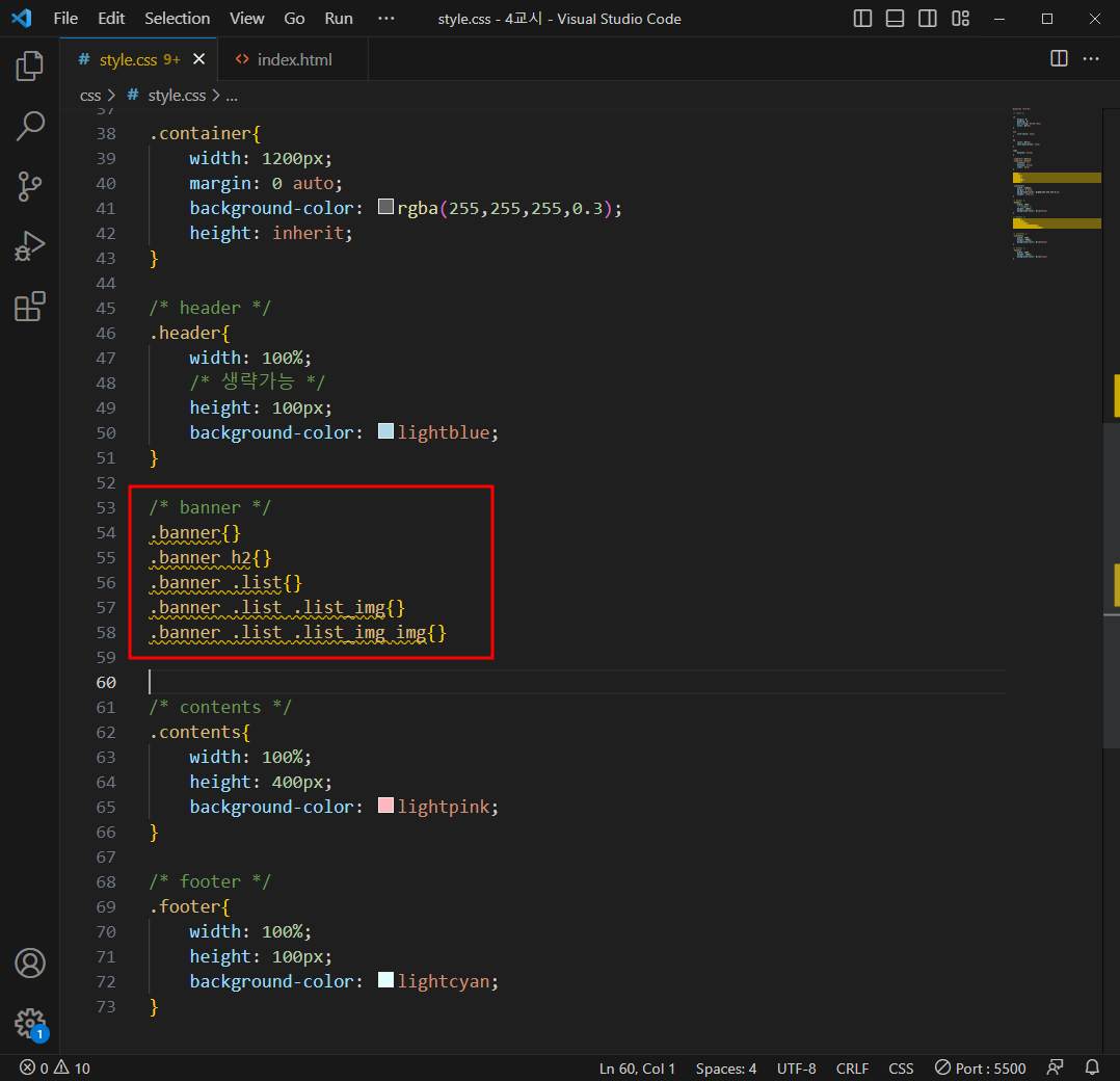 css 에 .container / 클래스 태그 style 넣어주기