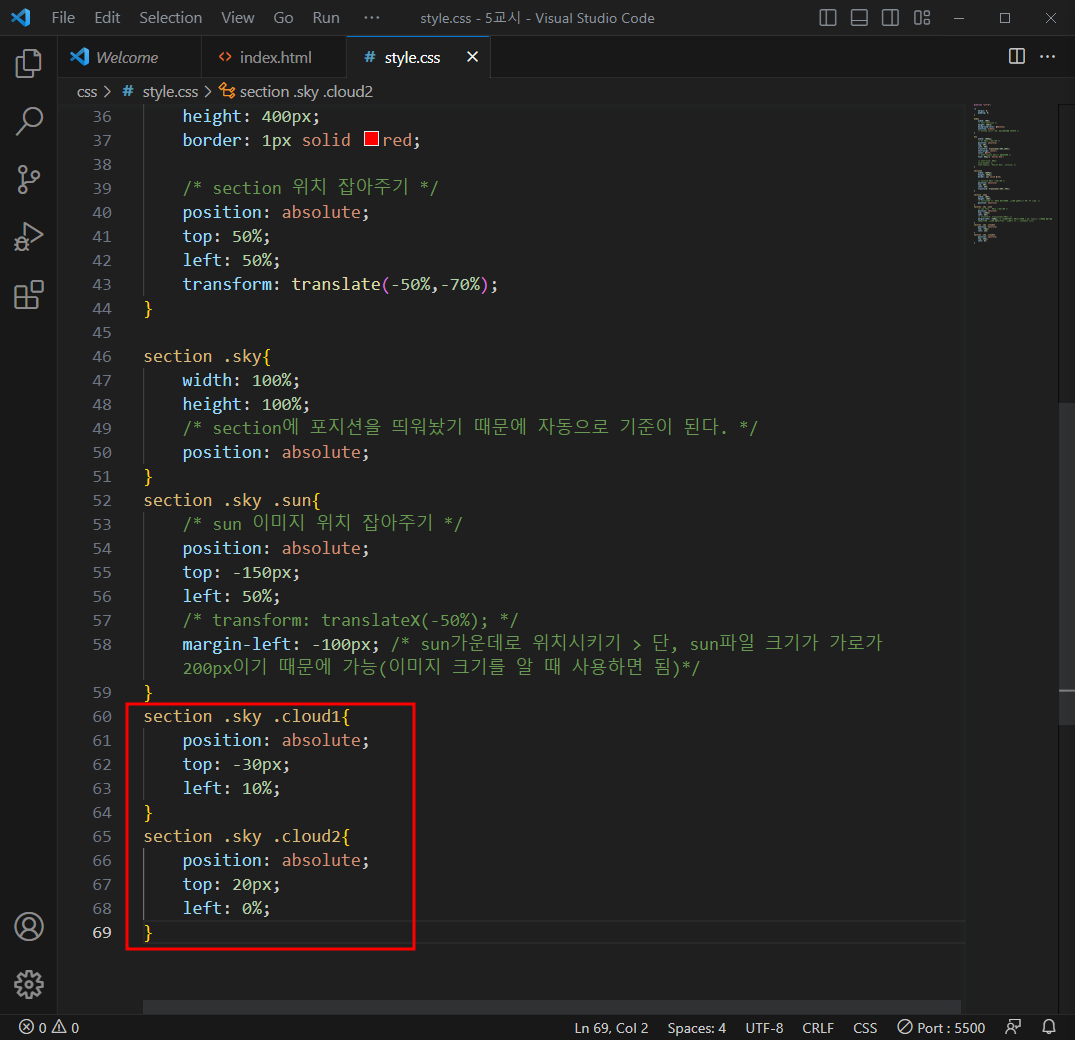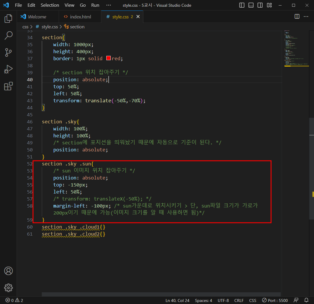 margin-left: -100px; /* sun가운데로 위치시키기 > 단, sun파일 크기가 가로가 200px이기 때문에 가능(이미지 크기를 알 때 사용하면 됨)*/