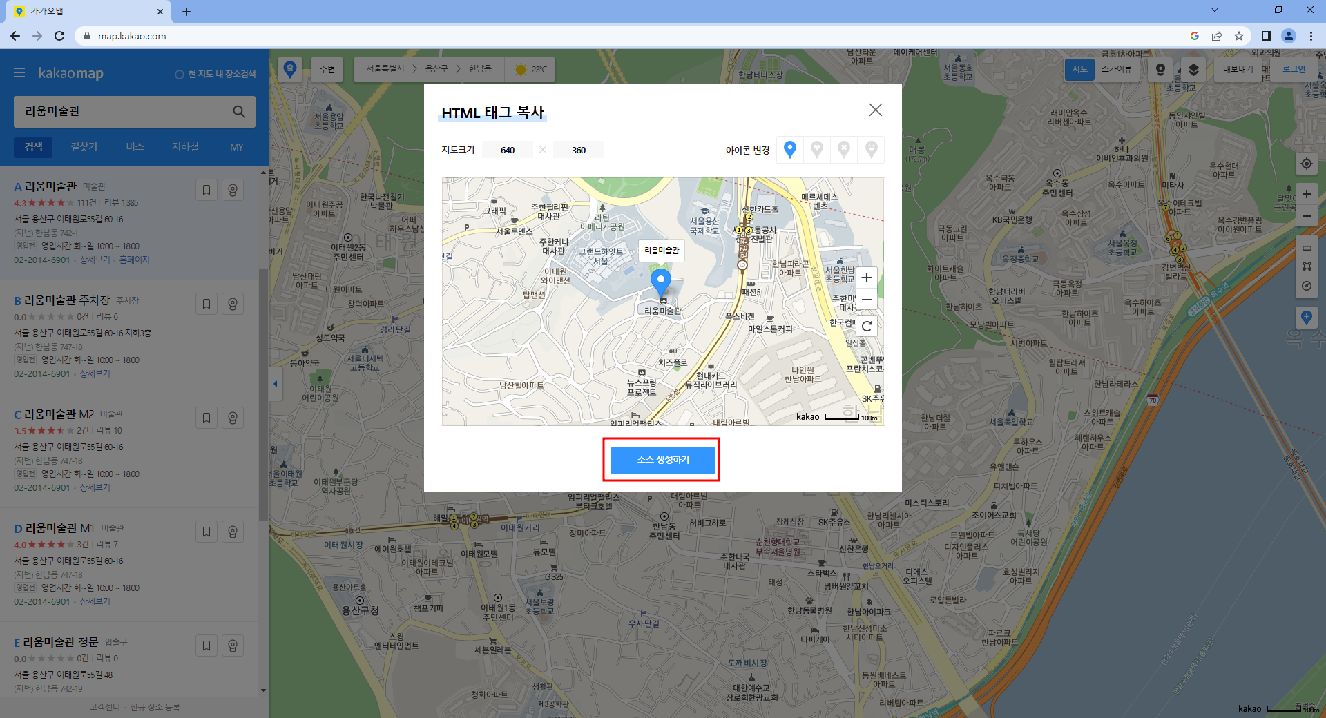 카카오맵 들어가서 장소 선택 > 3번째 단추 클릭하면 html 태그복사가있다.