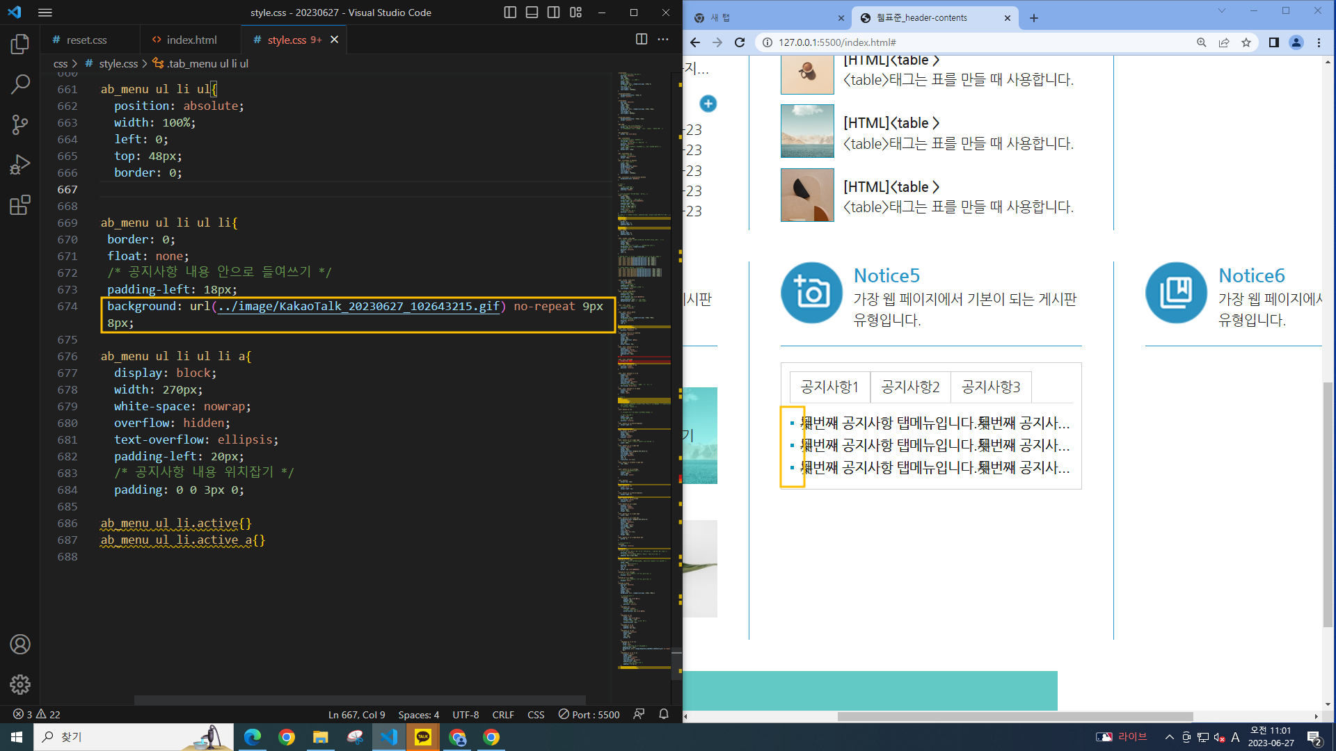 border 1px를 주었지만 공지사항 탭 사이에 border값이 겹쳐서 2px로 보인다.