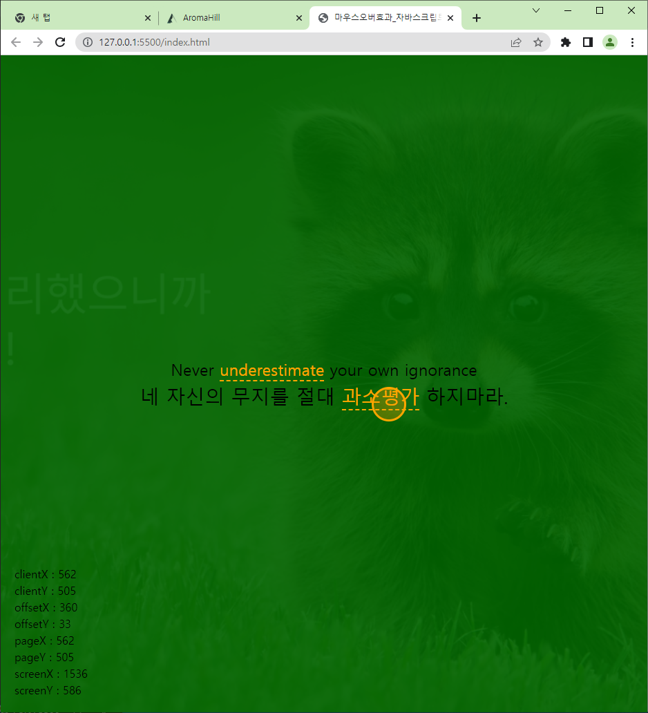 마우스를 움직이면 좌표값이 나오는 것을 콘솔에서 확인할 수 있다.