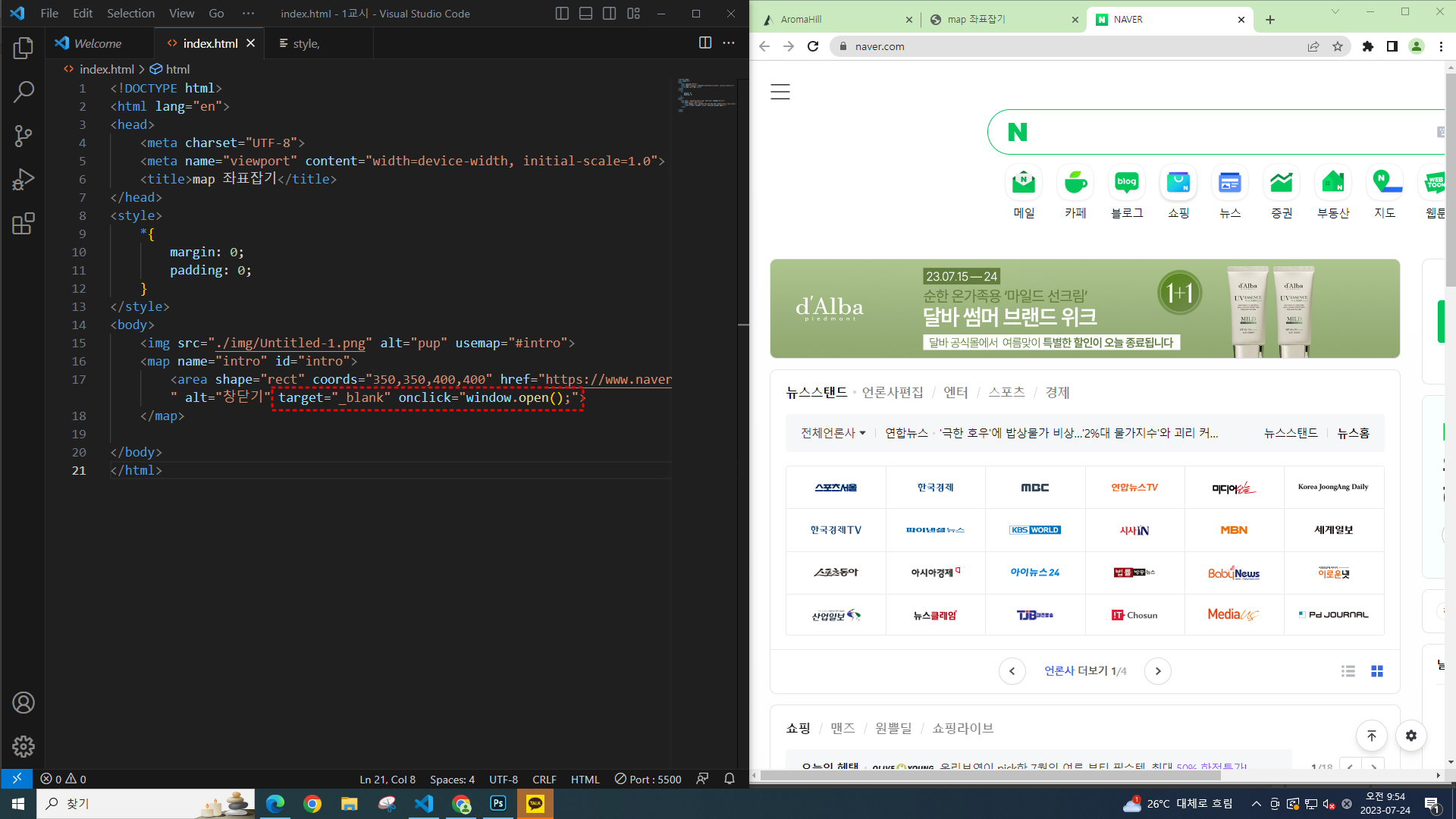 링크에 네이버 주소를 넣고 onclick에 alert 를 넣으면 네이버창이 열린다.