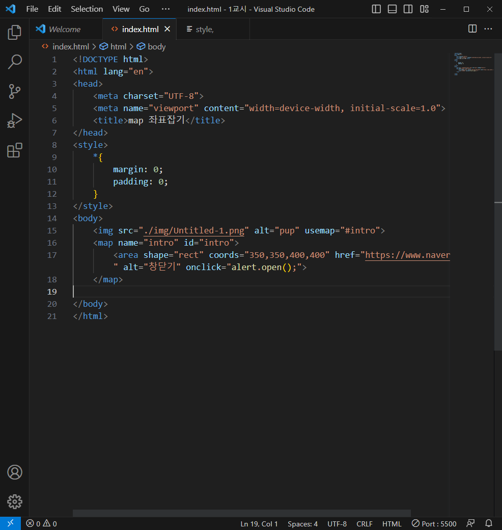 usemap으로 #intro 설정, map id = intro로 설정하여 이미지와 맵을 연동한다.