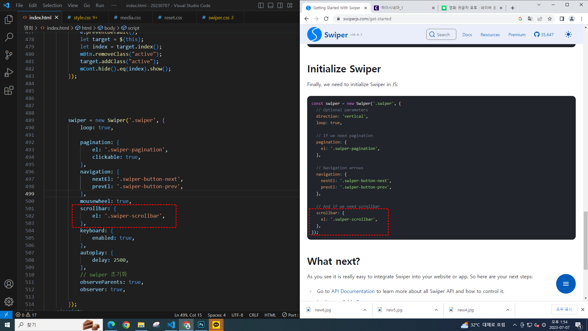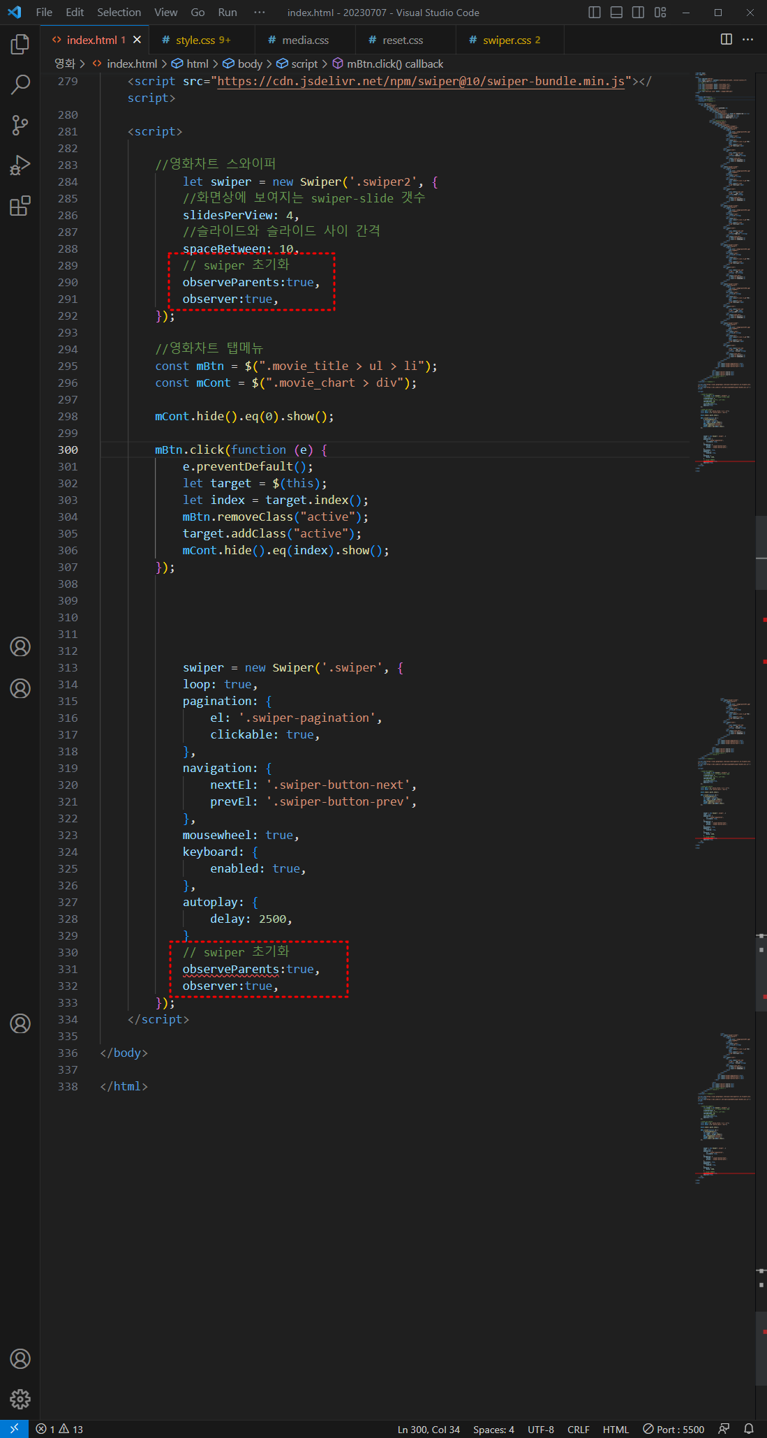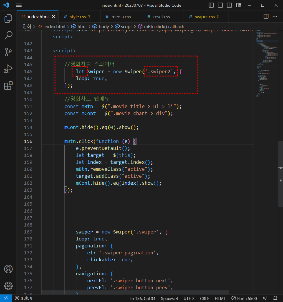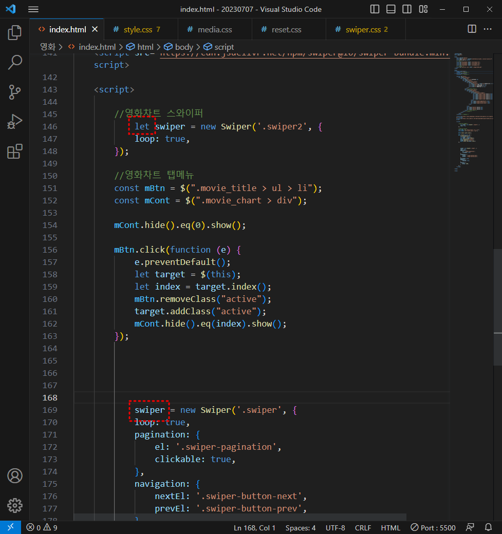 위에서 이미 swiper const 지정을 했기 때문에 const 대신에 let swiper로 변경한다.