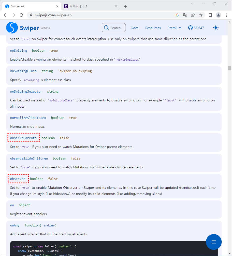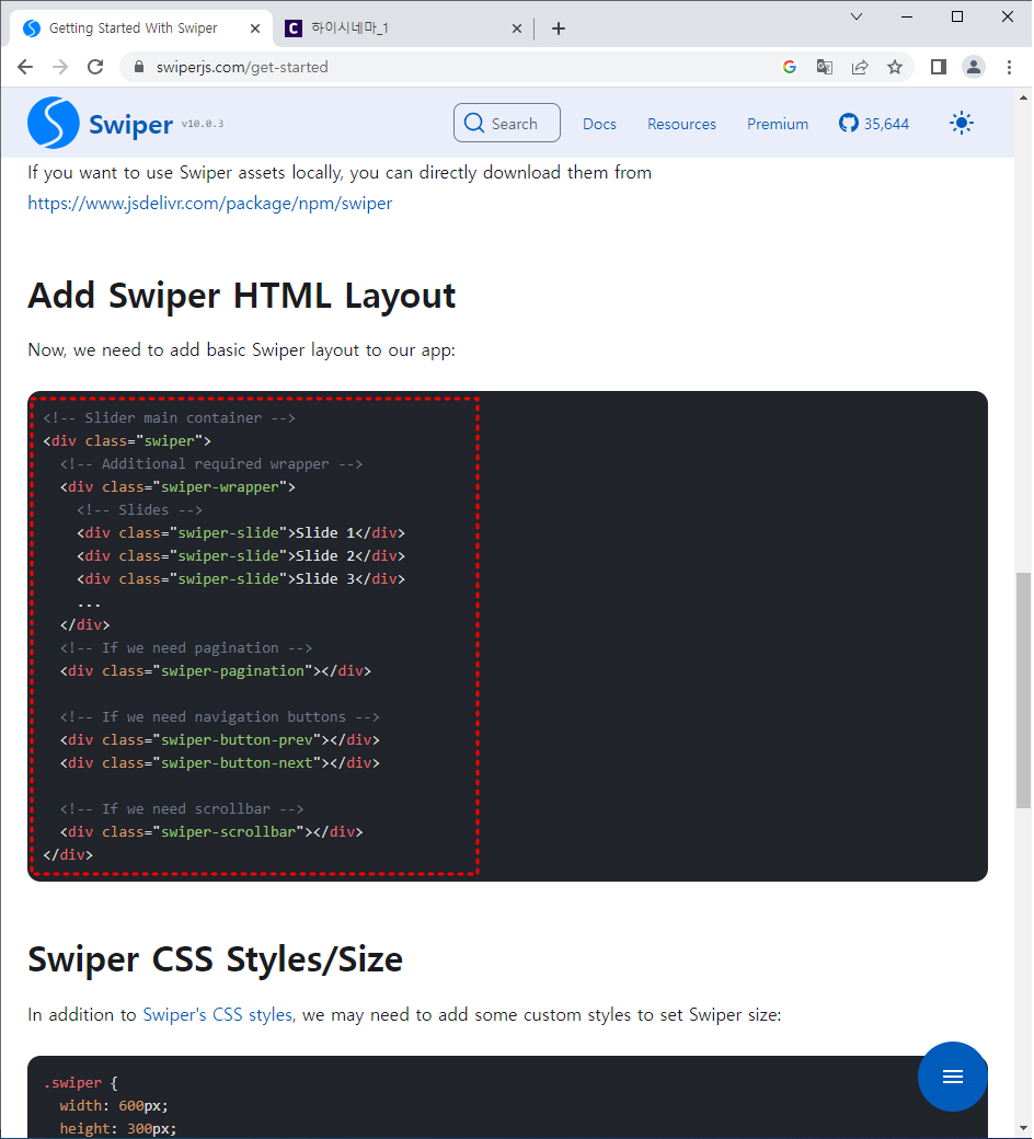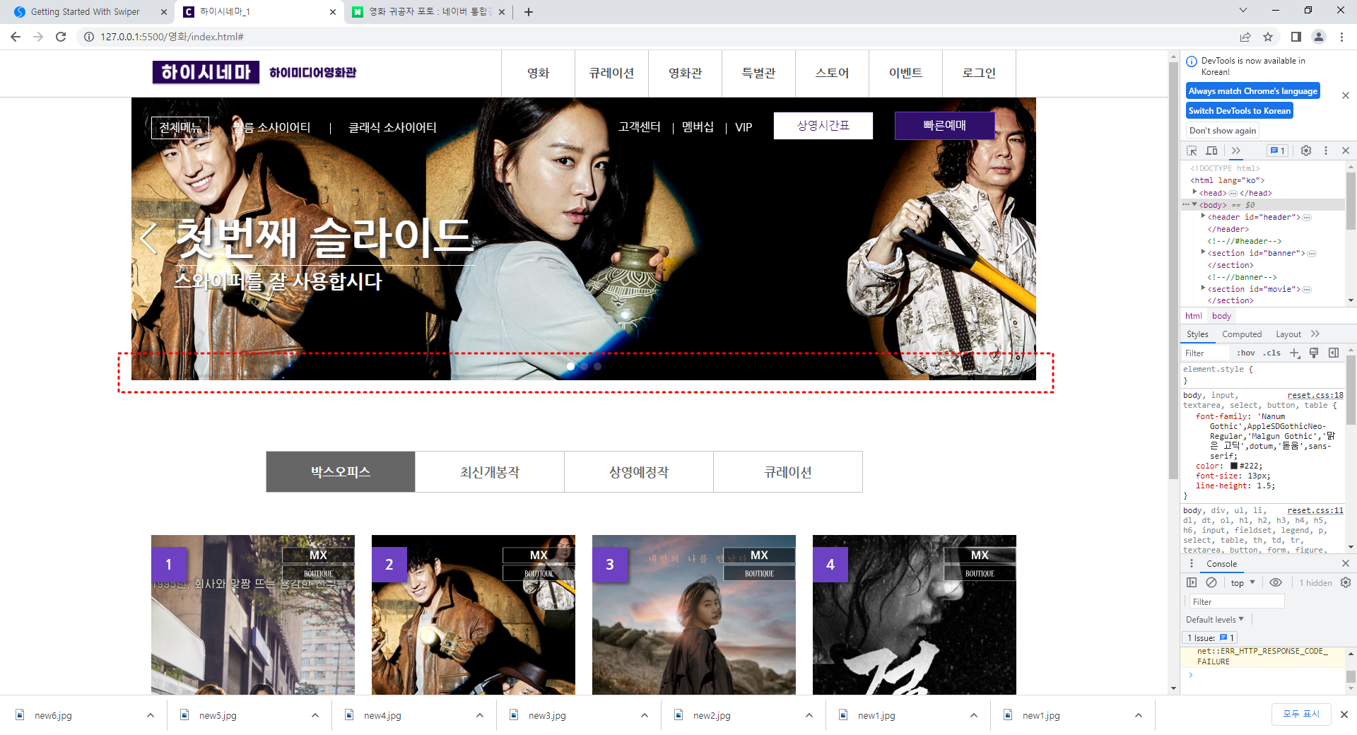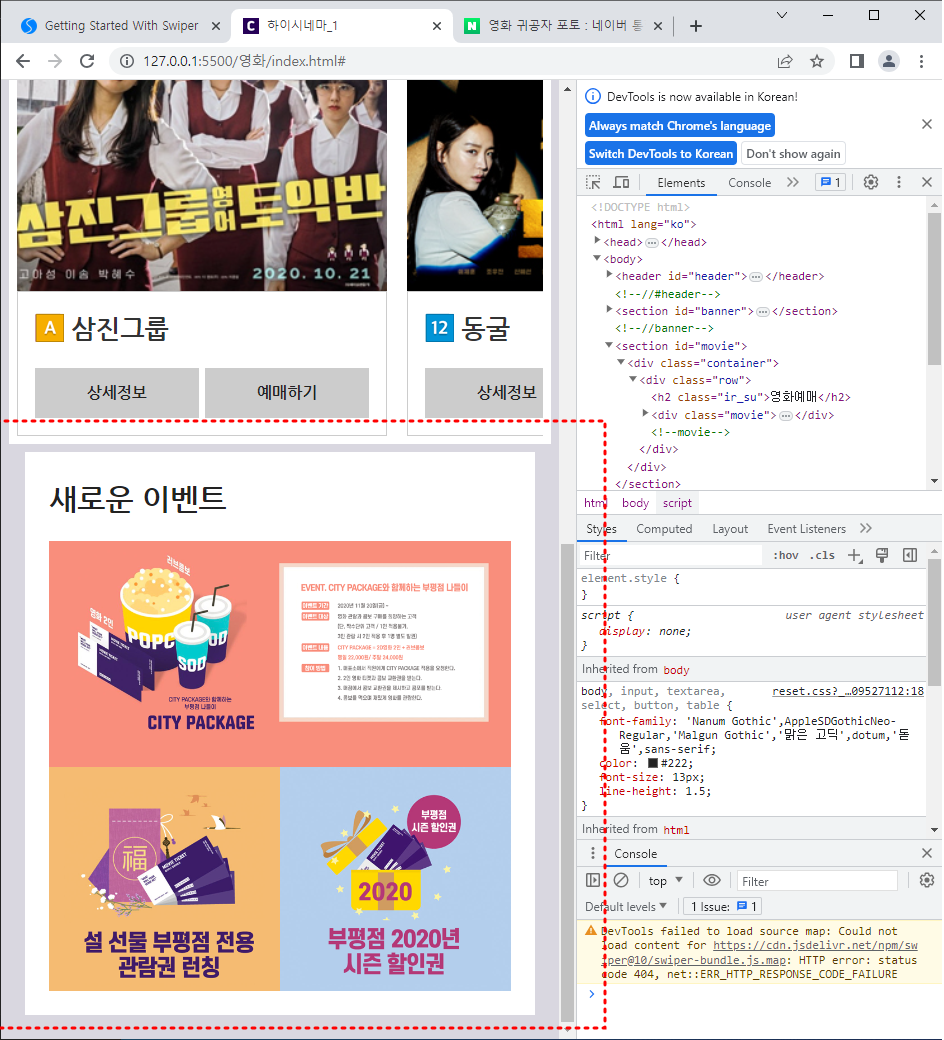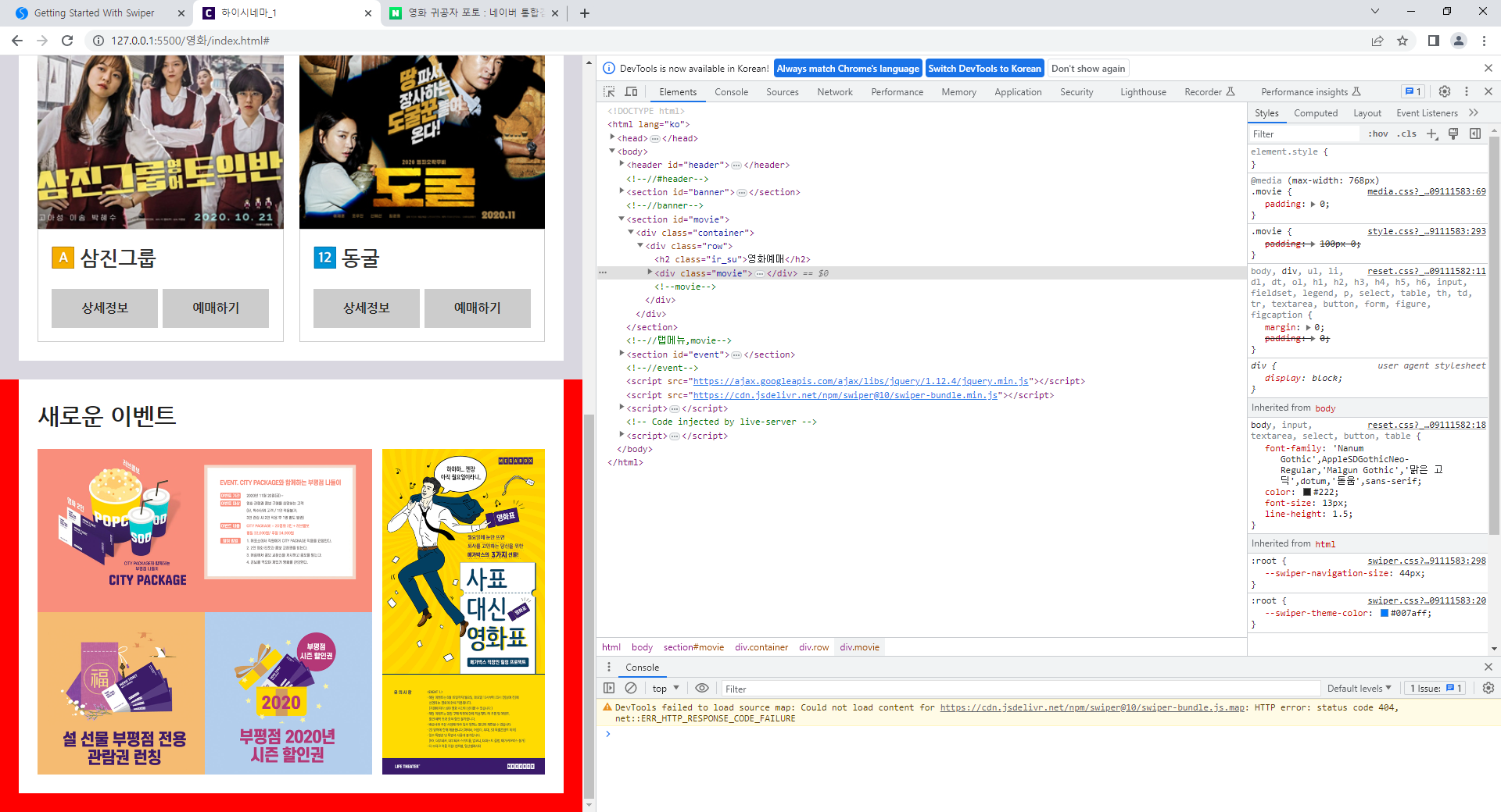 위에서 이미 swiper const 지정을 했기 때문에 const 대신에 let swiper로 변경한다.