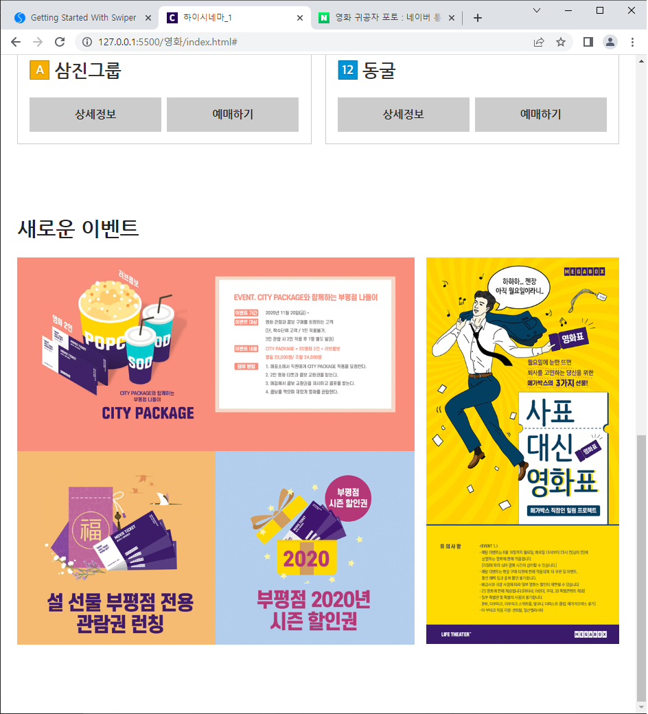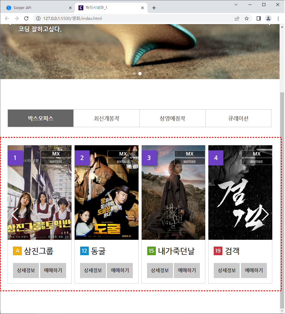 이제 각 .swiper-slide div 안에 각 .poster부터.info_btn 을 복사해서 붙여넣기한다.