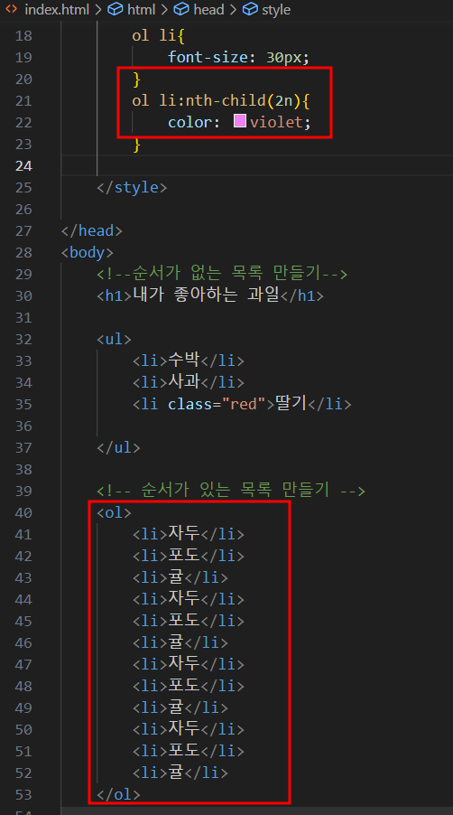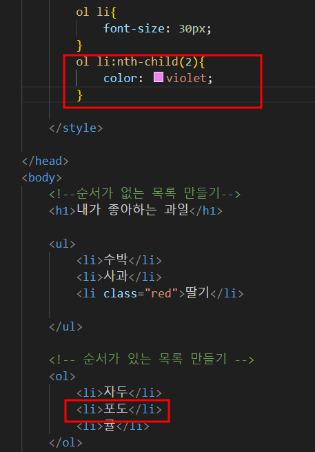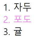 ol의 li 두번째 (포도) 가 바이올렛으로 변경됨