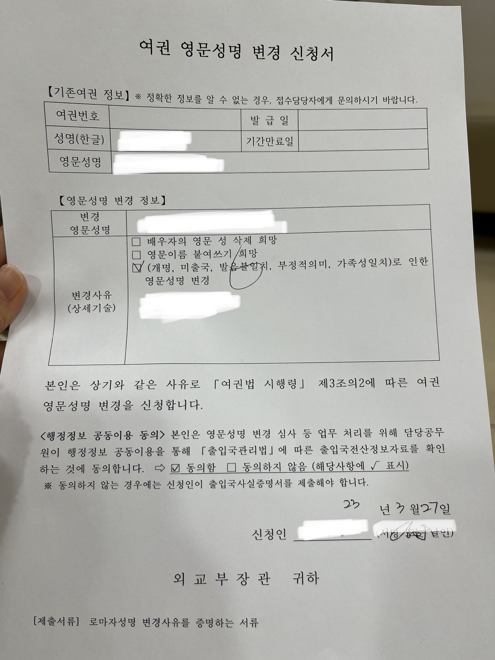여권 영문성명 변경신청서를 받으셔서 작성하시고
