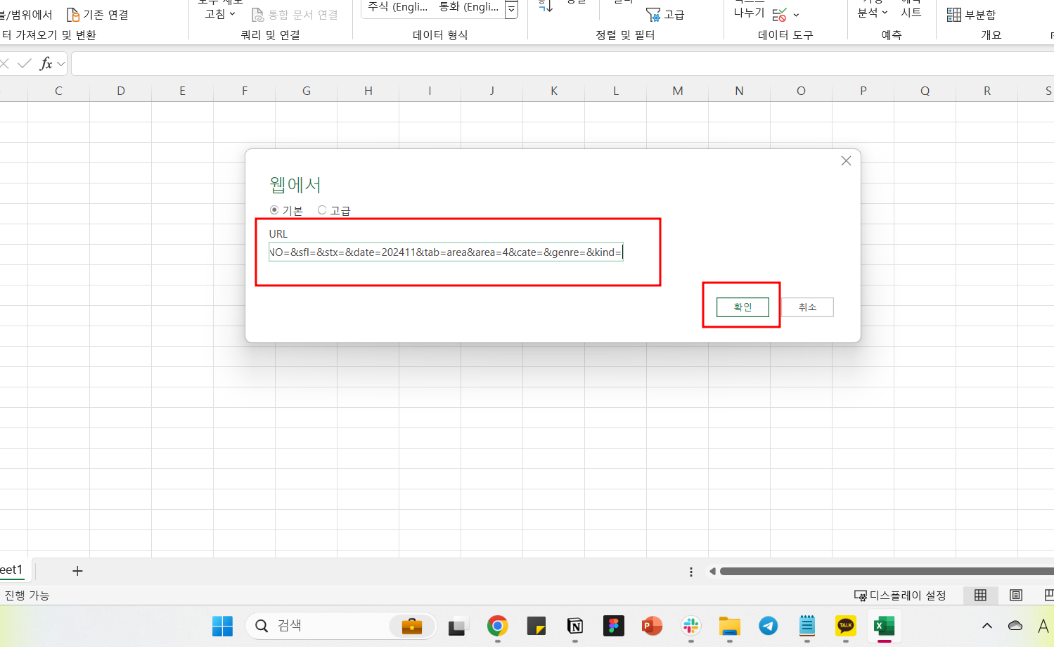 3. 데이터 > 웹 클릭 > url 붙여넣기 > 확인