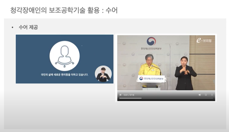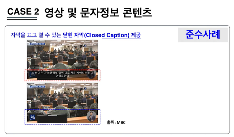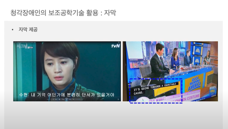 1. 청각 장애인이 자막을 통해 음성이나 음향 정보에 접근 가능하게 하며, 수어를 제공하는 콘텐츠에도 접근이 용이하다.