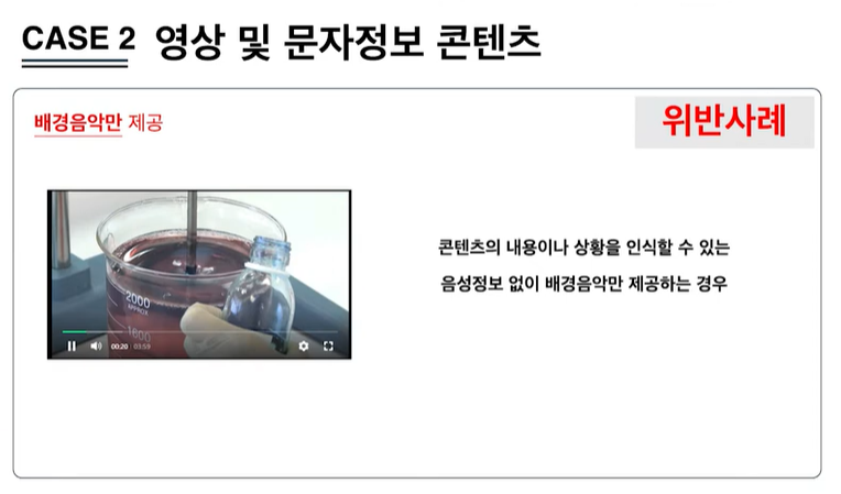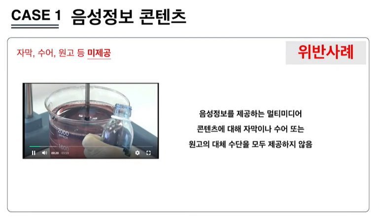 1. 장애인이 멀티미디어 콘텐츠를 비장애인과 동등하게 인식할 수 있도록 자막, 대본 또는 수어를 제공해야하며 멀티미디어