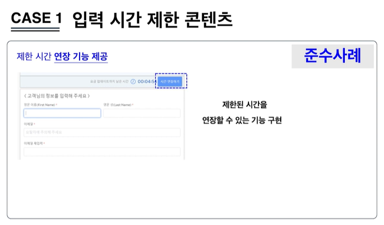 1. 웹 콘텐츠 제작 시 시간 제한이 있는 콘텐츠는 가급적포함하지 않는 것이 바람직하며, 보안 등의 사유로 시간제한이 반드시 필요할 경우에는 이를 회피할 수 있는 수단을 제공해야한다.