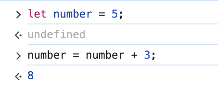 let이 없을 때는 코드가 식이라서 대입한 값이 결과값으로 출력되지만, let이 옆에 붙는 순간 선언문이 된다.