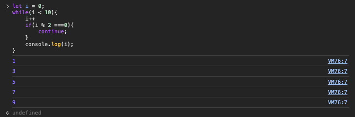 가끔 반복문이 특정 조건에서만 실행되기를 원할 수 있다. continue 문을 넣으면 이 후 코드는 건너뛰게 된다.
