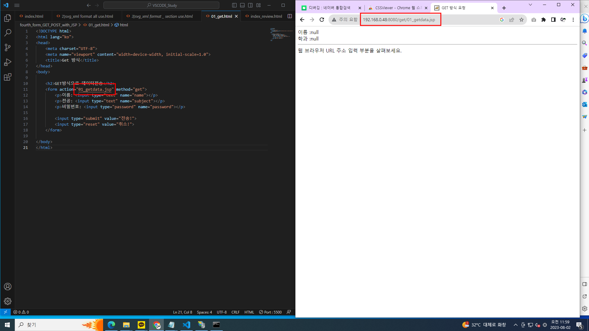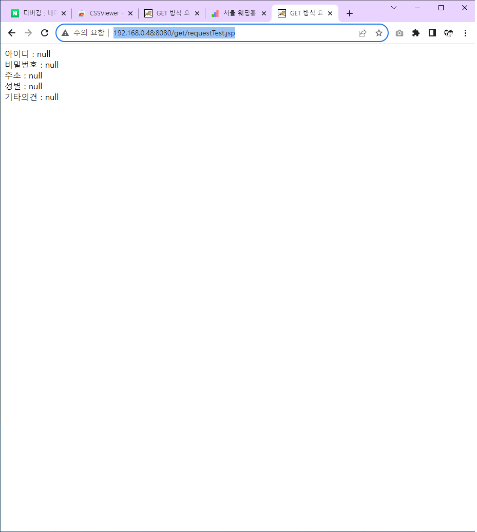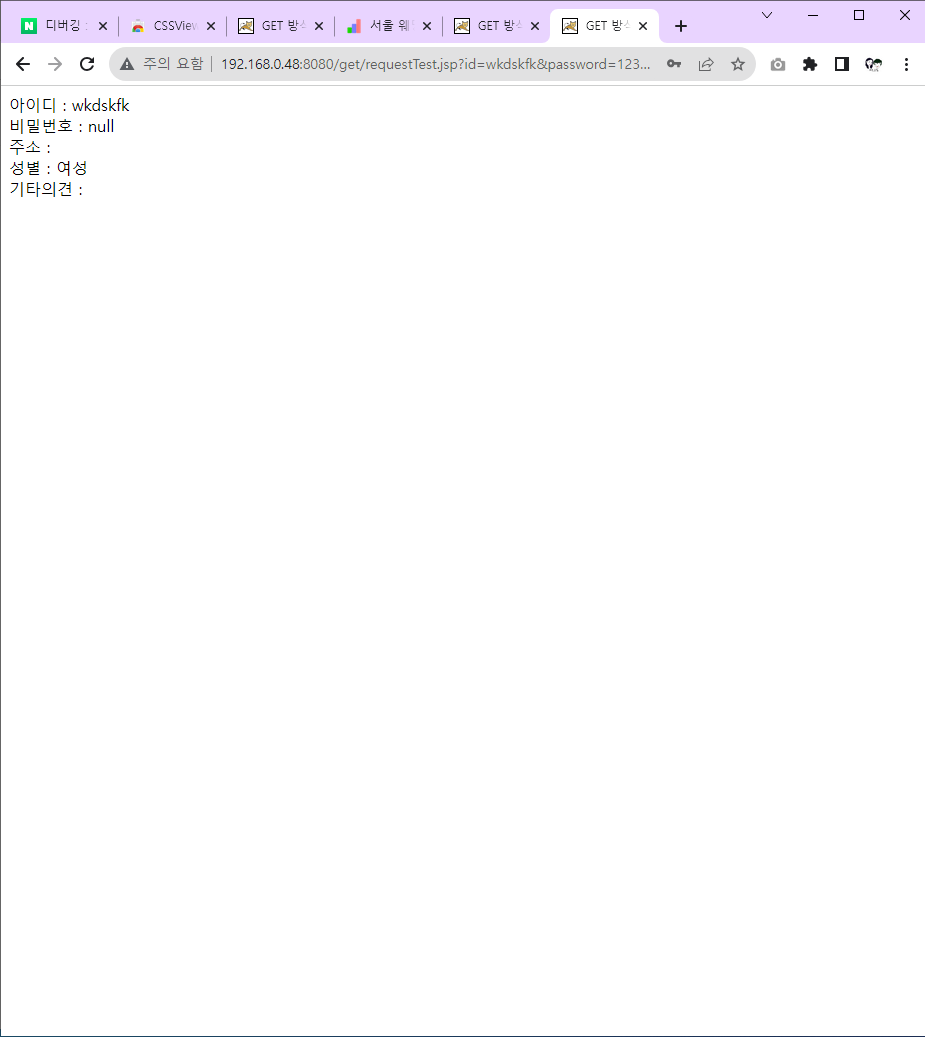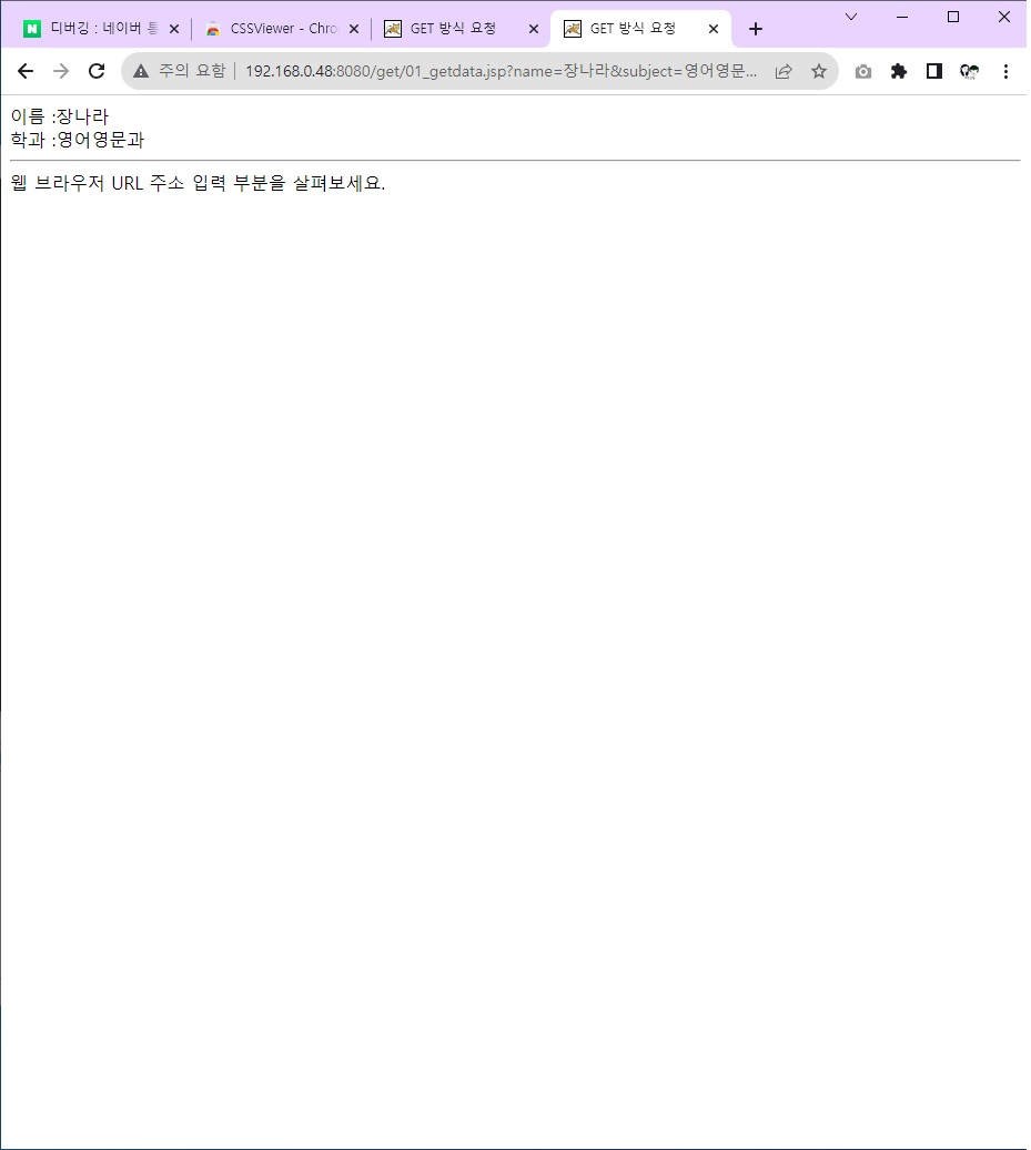 주소창에 http://192.168.0.48:8080/get/01_getdata.jsp 를 넣으면 vscode에서 작성한 내용이 출력된다.