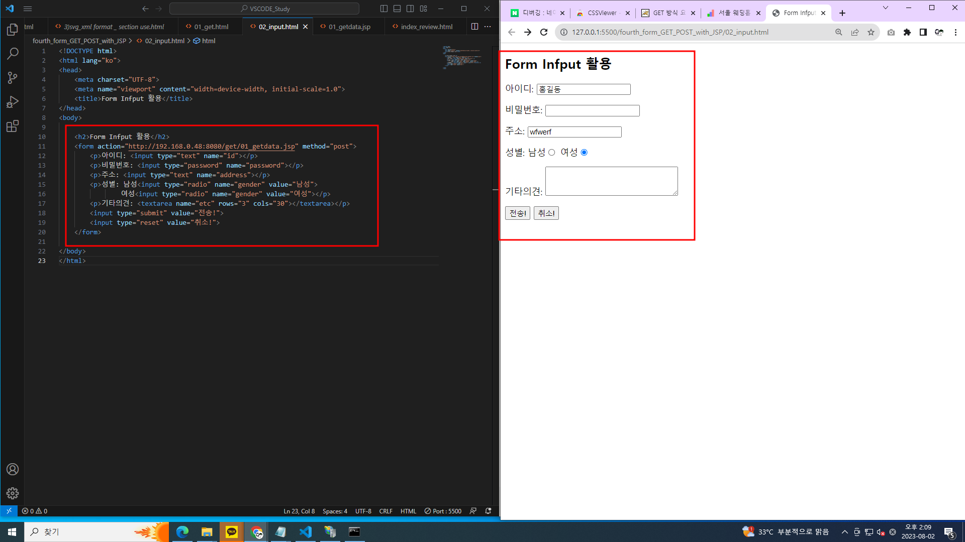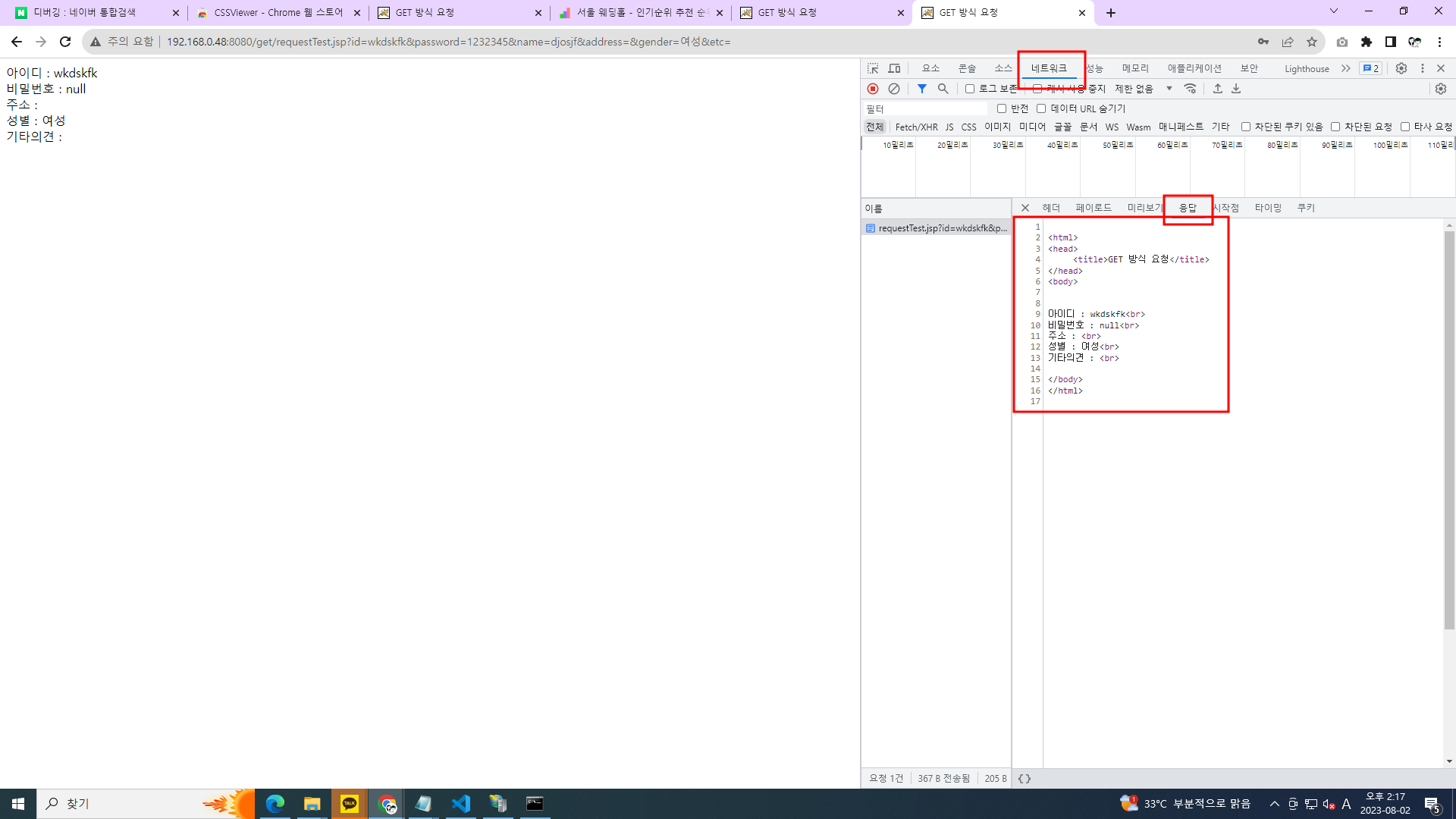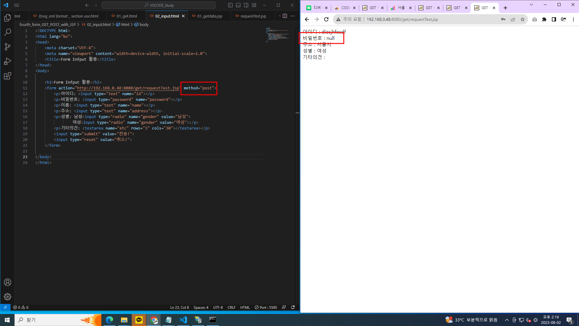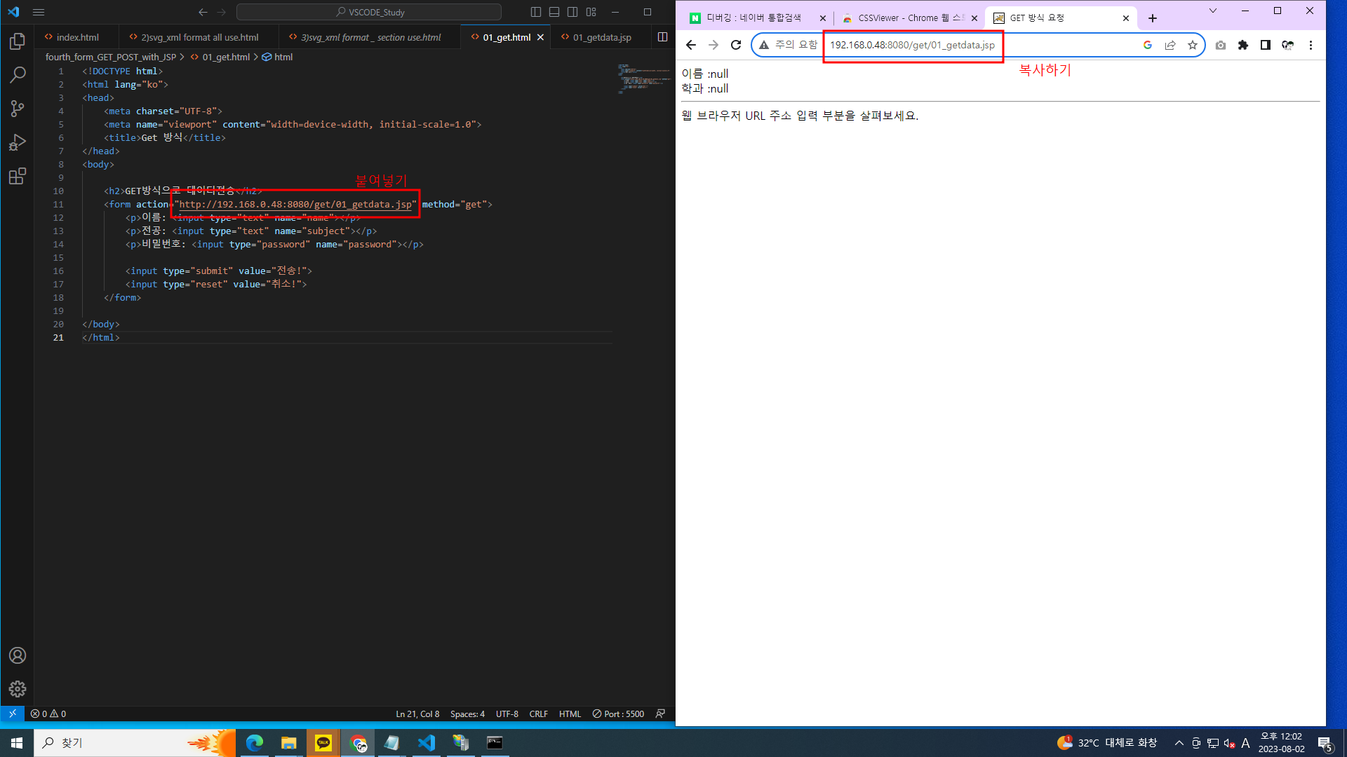 주소창에 http://192.168.0.48:8080/get/01_getdata.jsp 를 넣으면 vscode에서 작성한 내용이 출력된다.