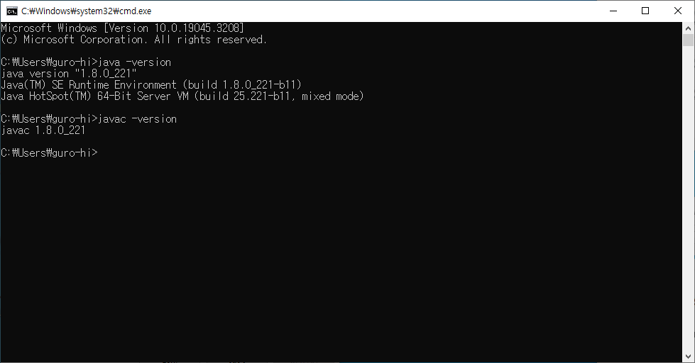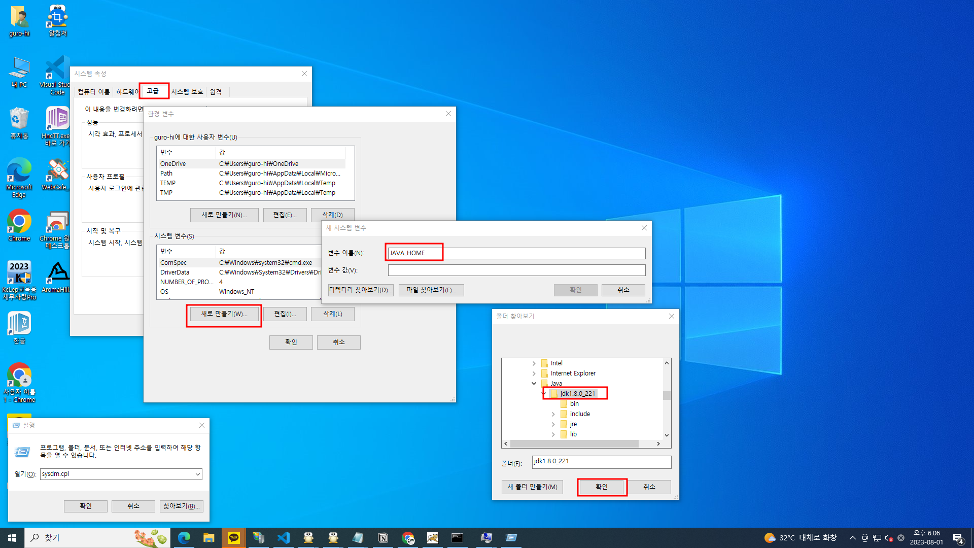 3) 윈도우즈키 + R키 - cmd - Ctrl+F 찾기에서 jdk1.8.0_221 입력해서 Path 경로 설정을 확인해 봅니다.