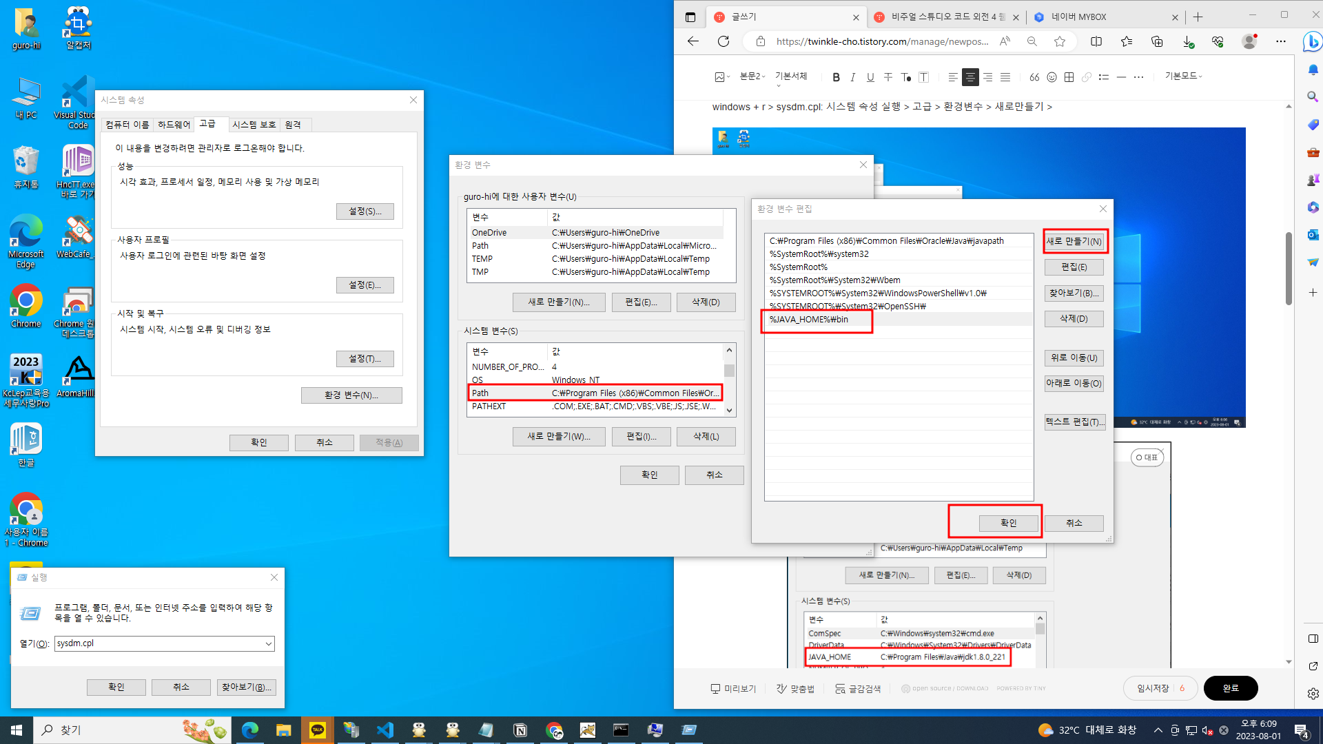 1) 윈도우즈키 + R키 - sysdm.cpl - 고급 - 환경 변수 - "시스템 변수" 에서 "새로 만들기" 버튼 클릭