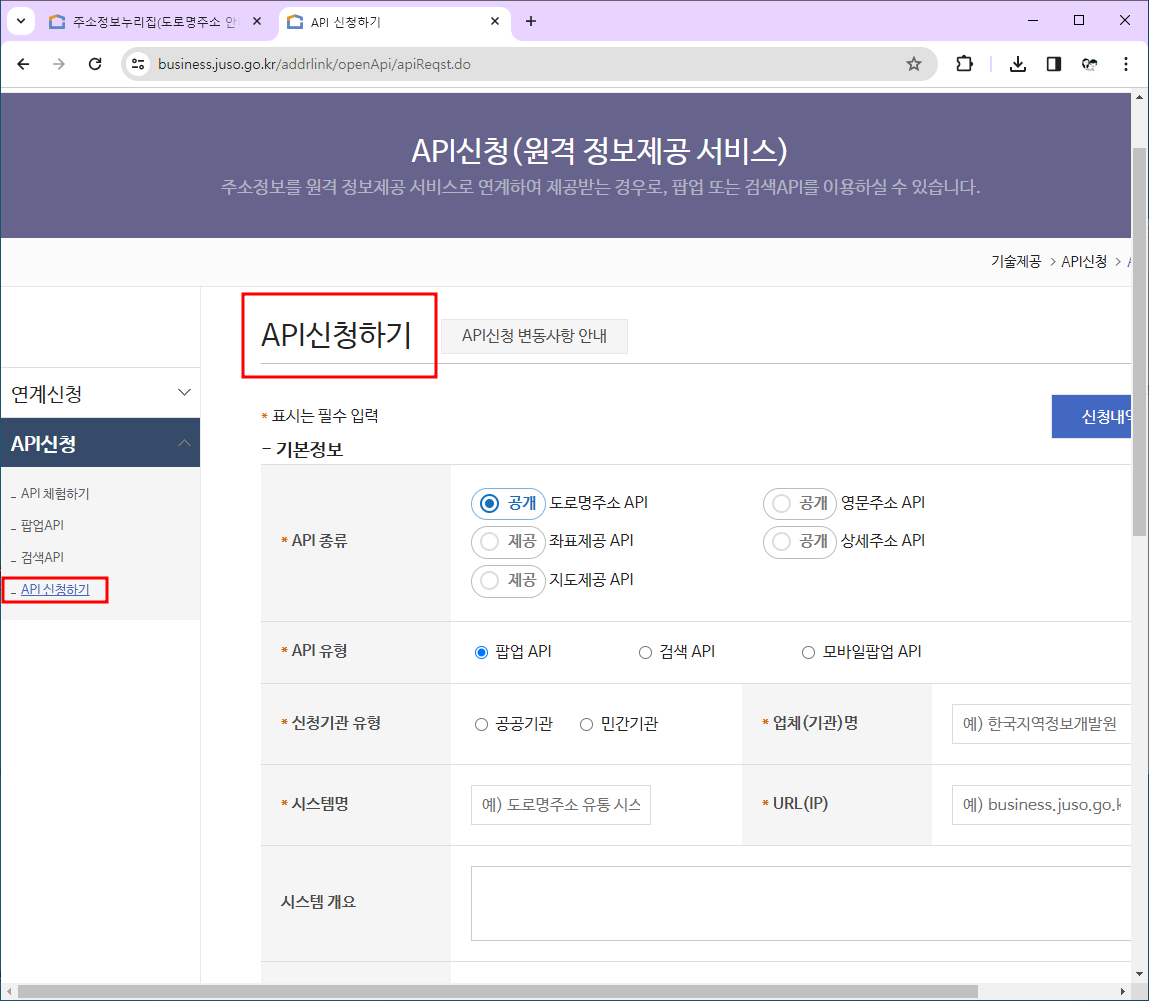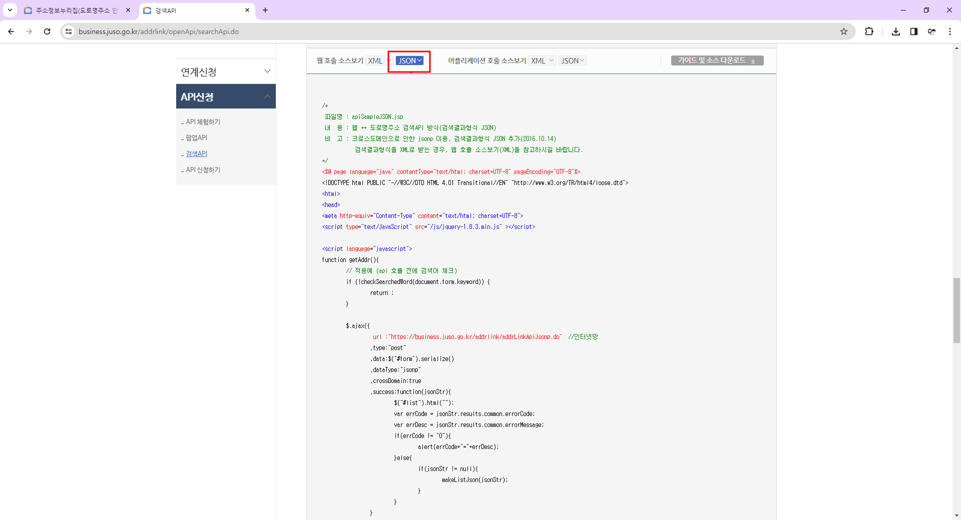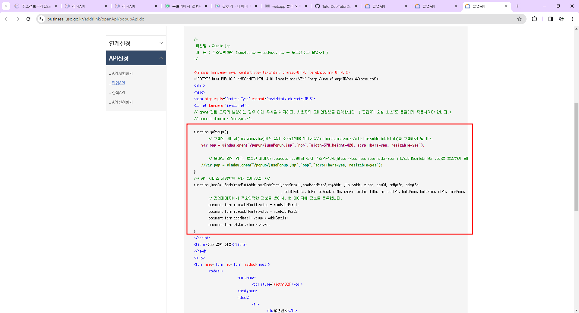 //하단 "주소입력화면 소스보기"를 클릭해서 참고합니다.