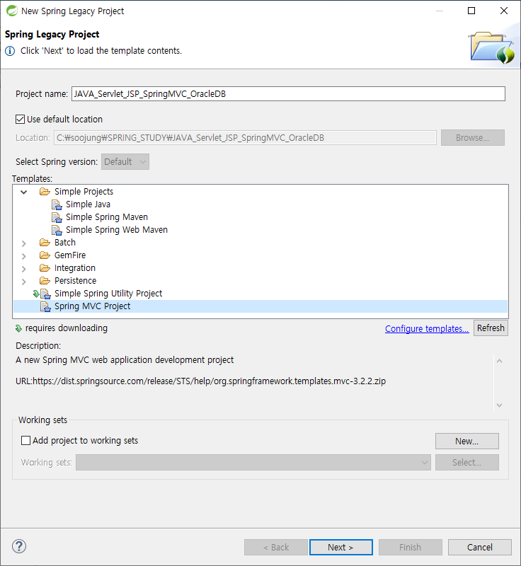 중앙에 Templates: 에서 하단에 Spring MVC Project 클릭