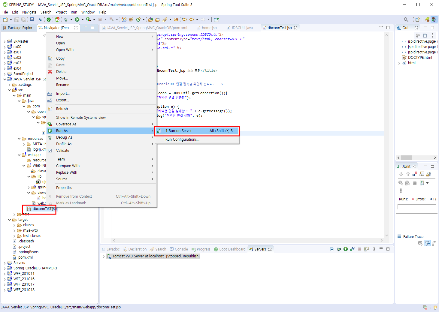 1) JAVA_Servlet_JSP_SpringMVC_OracleDB 프로젝트 클릭 선택 - 마우스 우클릭 - Run As - Run on Server 클릭 : [처음 화면] 확인함