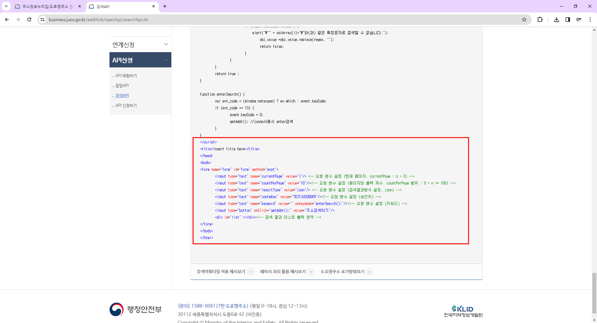<input type="hidden" id="confmKey" name="confmKey" value="이자리에 Open API 키를 기재하시기 바랍니다"/><!-- 요청 변수 설정 (승인키) -->